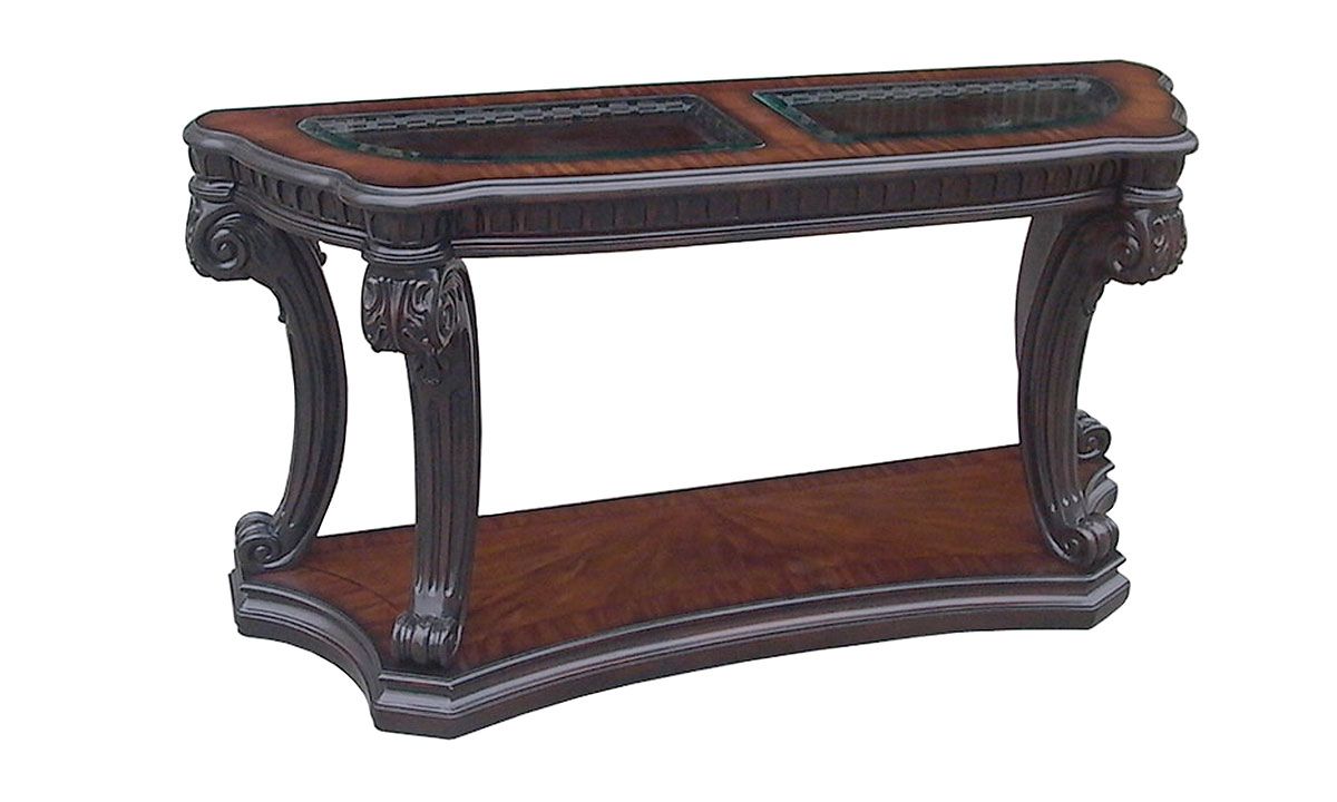 A welcome addition to a living room or formal entrance, the Carnegie Manor Sofa Table imbues fine, traditional style on any living space. Carefully crafted from Poplar solids and Prima Vera veneers with striking Walnut inlays, the rich, Dark Cinnamon finish lends an inviting warmth and depth to this timeless 58-inch wide sofa table. Inspired by old world, European designs, this piece pairs a thick glass inset tabletop with an egg-and-dart adorned table apron sitting on a striking C-scroll pedestal base, the four legs distinguished by ornately carved corbels and deep fluting.