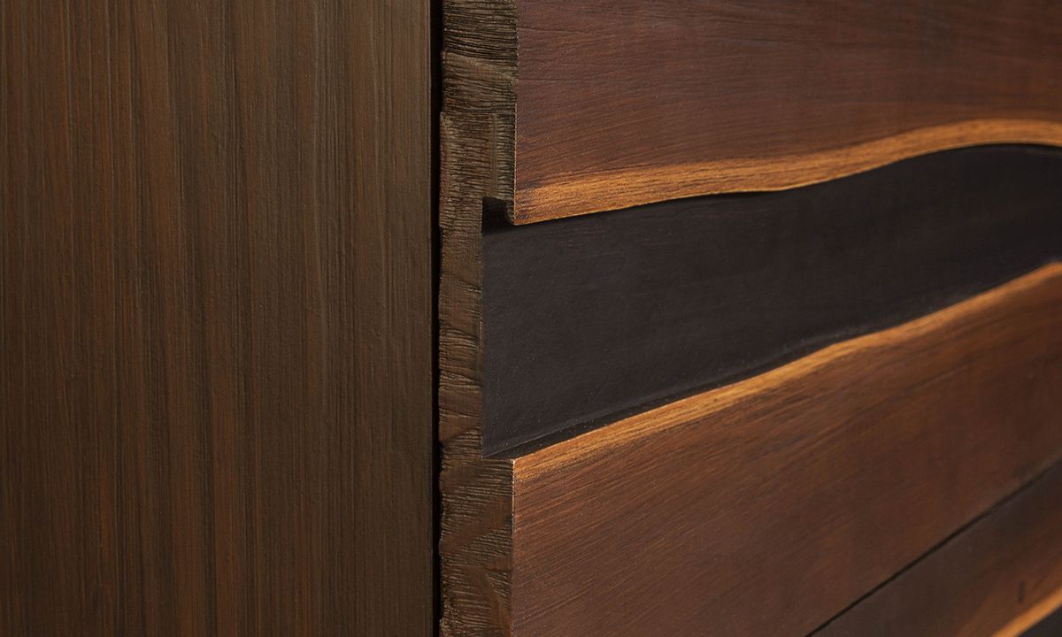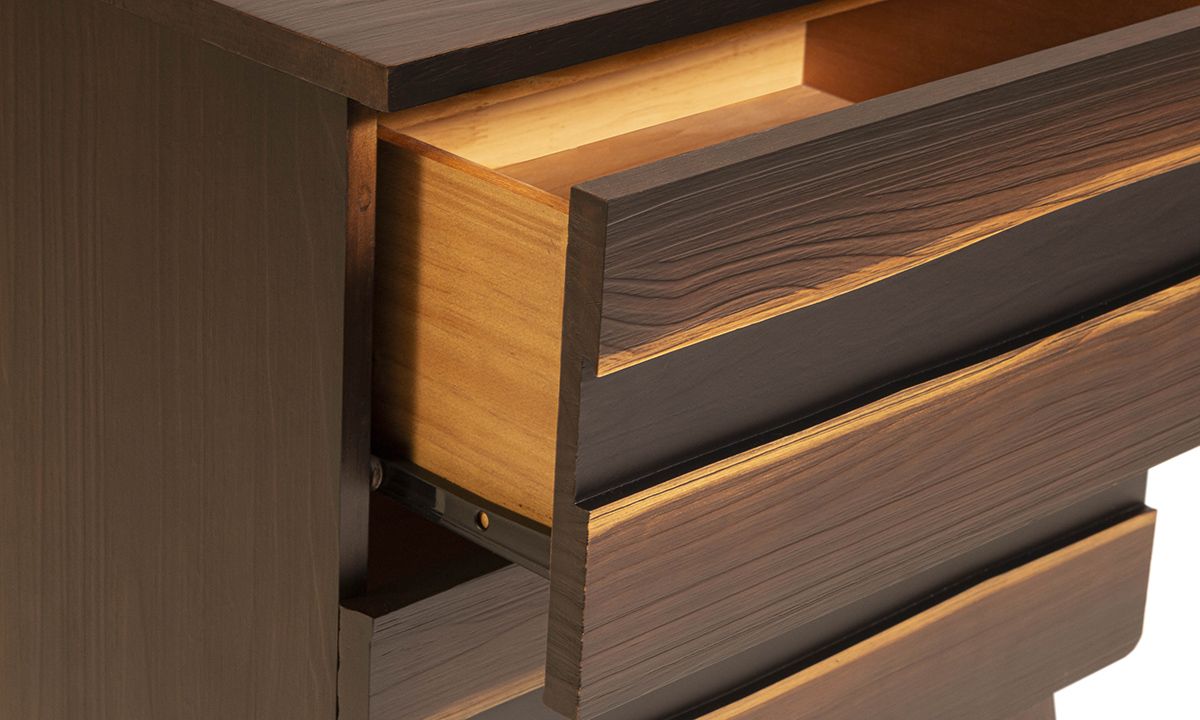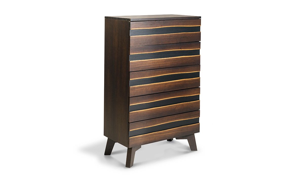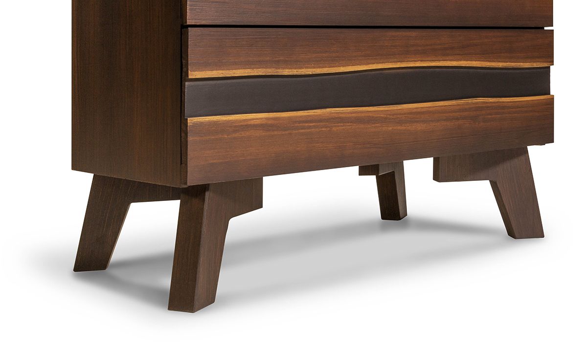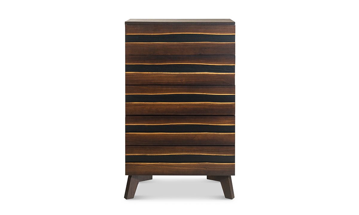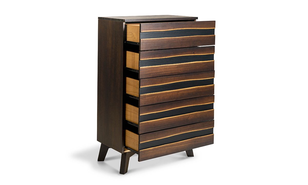 Complete your modern bedroom retreat with the contemporary design and eco-conscious craftsmanship of the Green Brown Solid Pine 5-Drawer Chest. Crafted from sustainably sourced solid Brazilian Pine, this 48-inch tall storage chest balances a modern profile and splayed legs with the organic warmth of the Brushed Brown wood finish. A striking stripe of dark brown and gold accentuates the natural graining in the wood while the five spacious storage drawers keep everything neatly organized.