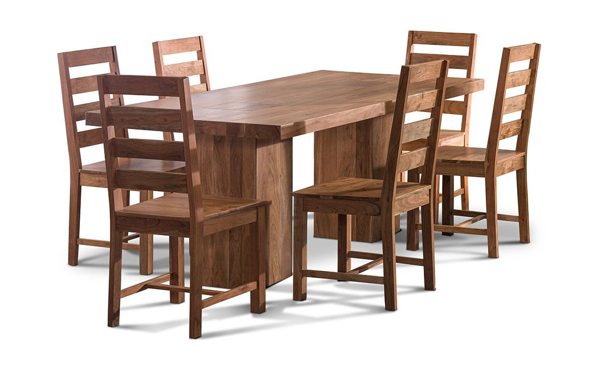 Stunning contemporary rustic sustainably sourced 82-inch quarter sawn Acacia Plank Dining Table paired with four dining chairs. Each piece is exceptional, substantial and handmade by skilled artisans.