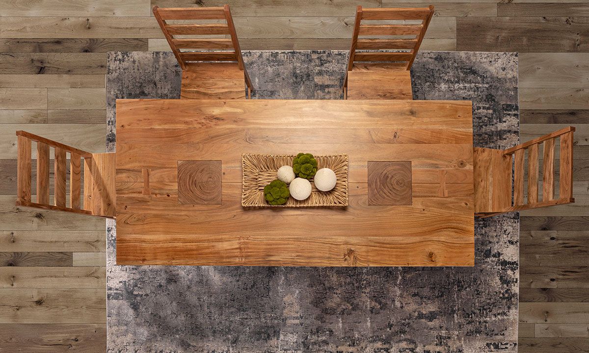 This timeless set includes a table and four chairs, each handcrafted by skilled artisans out of solid acacia wood. Made from entirely natural materials and handcrafted processes, each piece in this collection is unique and adds a simplistic touch to any dining or eating area.