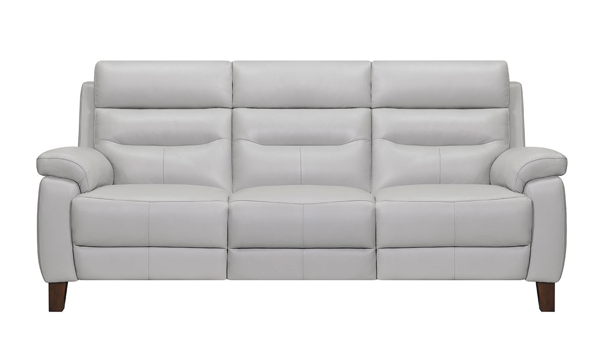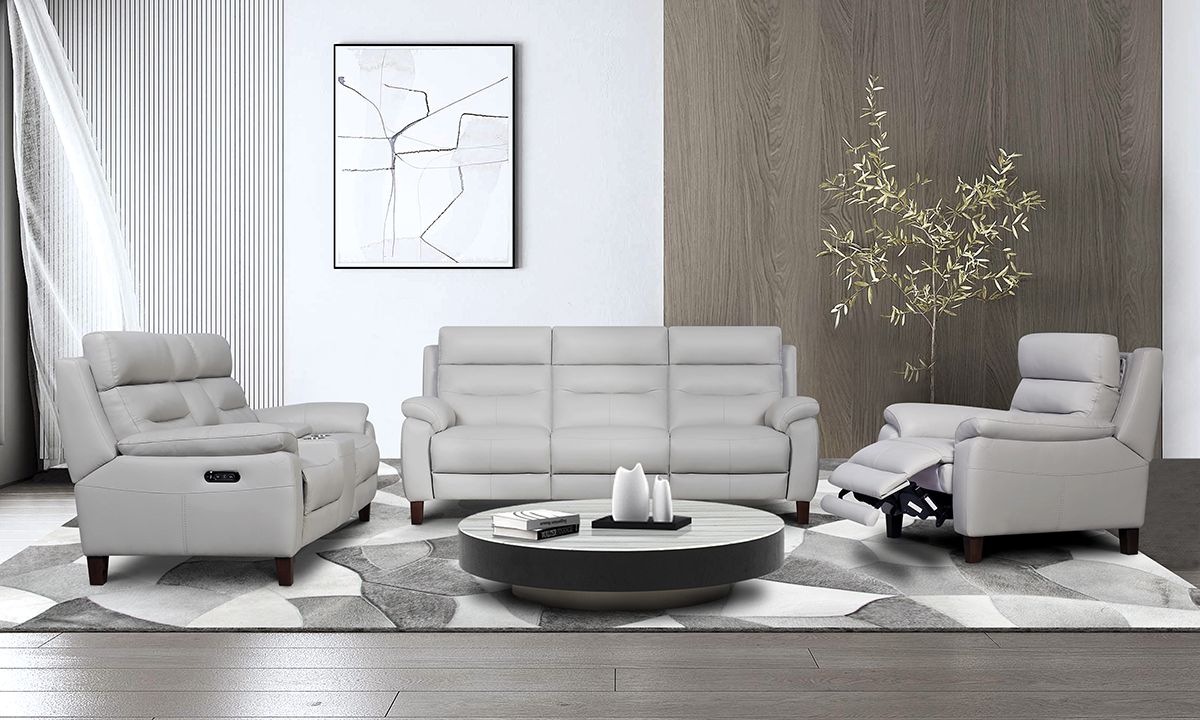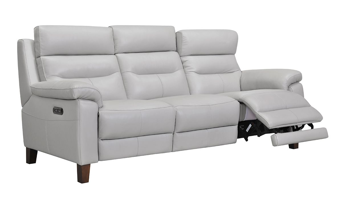 Redefining reclining furniture, the Jessica Jacobs Bergamo Dove Leather Power Reclining Sofa delivers high-end, customizable comfort and refreshingly modern style. The contemporary silhouette, distinguished by sculptural foldover armrests and a streamlined double bustle back design, is complimented by luxurious dove grey top grain leather upholstery. Sit back and relax as you employ the smooth power reclining motion of the two recliners available on each end of the sofa, which include power headrest and reclining controls and a convenient USB charging port in each outer arm push button control panel.
