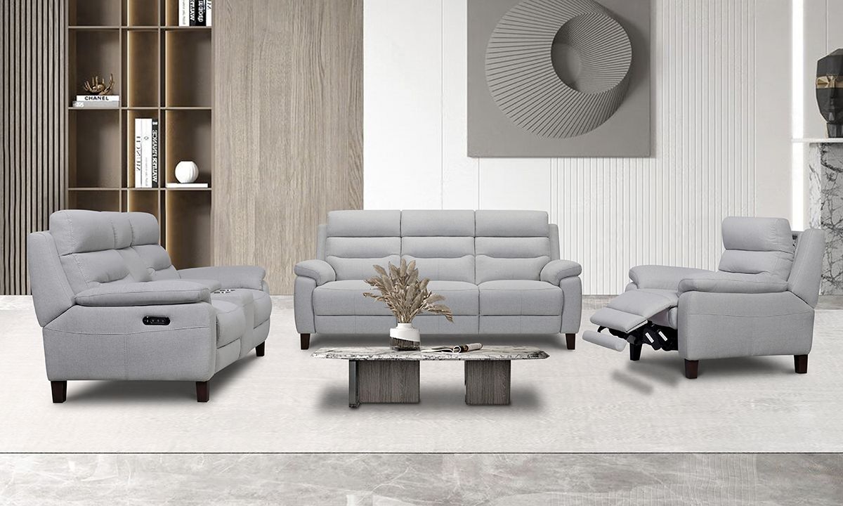 With the looks of a designer accent chair and the comfort and functionality of a high-end recliner, the Jessica Jacobs Bergamo Stone Power Recliner offers the best of both worlds. Distinguished by a modern double bustle back profile, sculptural foldover armrests and contemporary tapered wood legs, the tailored stone grey fabric upholstery lends a luxurious finishing touch to this 40-inch tall recliner. Personalizing your reclined and headrest position is as easy as the push of a button thanks to the convenient push button control panel located on the outer right arm which comes complete with a USB charging port.