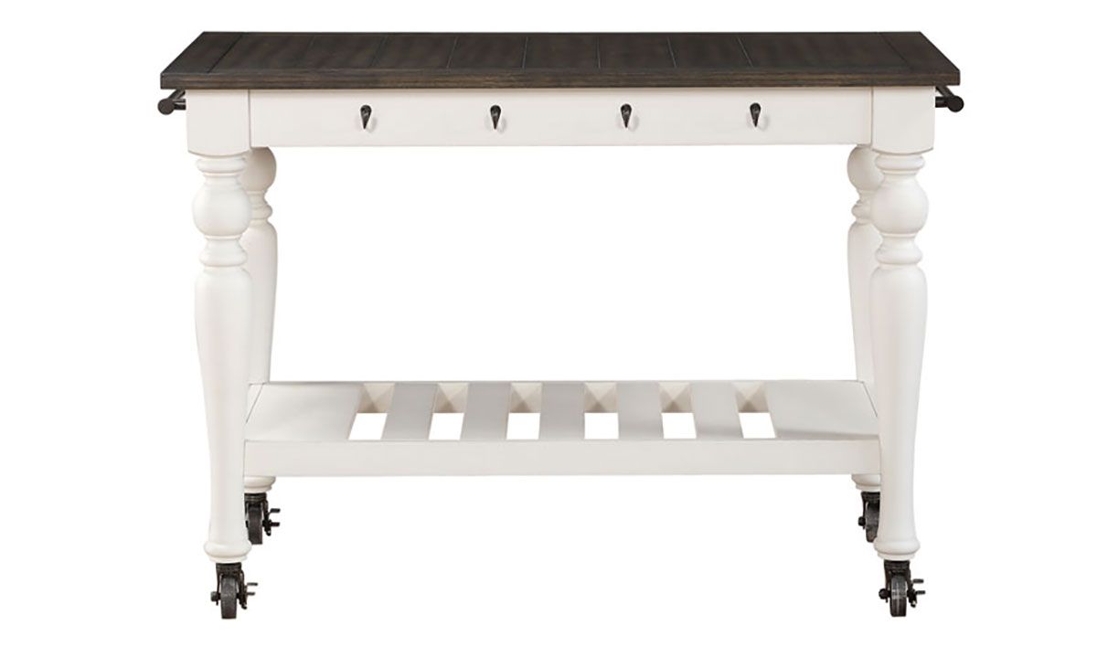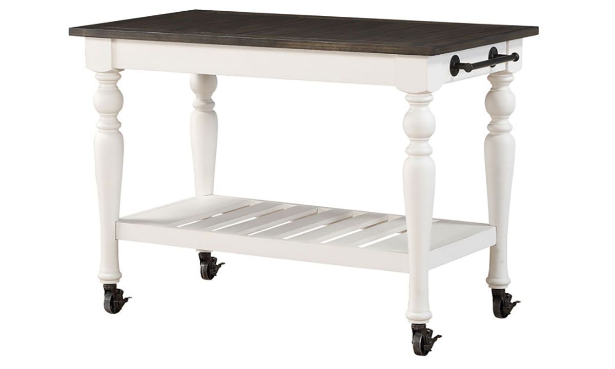 As a central gathering spot in the kitchen or extra serving surface in a dining room, the Joanna Two-Tone Farmhouse Kitchen Cart is a versatile and stylish addition to any space. Crafted from Hardwood solids and Acacia veneers, this 51-inch wide kitchen cart features a casual, farmhouse-inspired Ivory and Mocha two-tone wood finish. The traditional silhouette, with its elegant turned wood legs and plank-style surface meets convenient, modern utility with rolling castered feet, handy hooks, a slatted bottom shelf for extra wine storage and dual handle bars on each end.