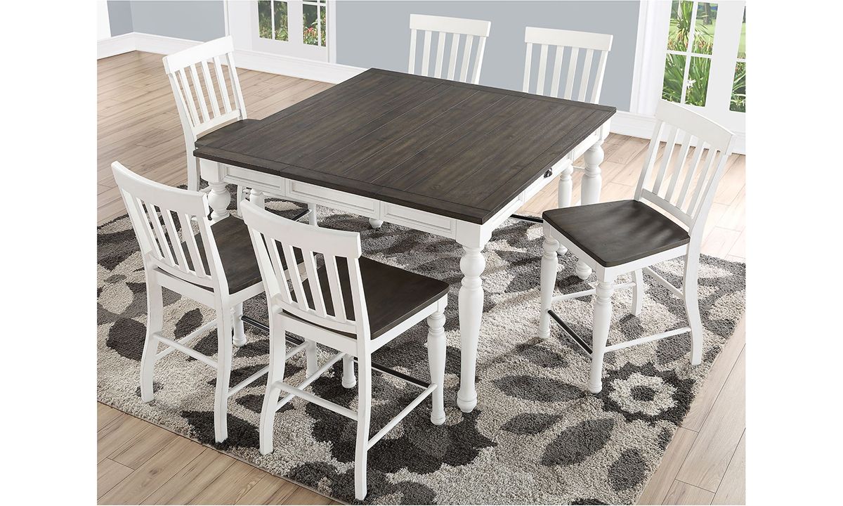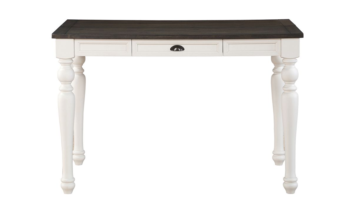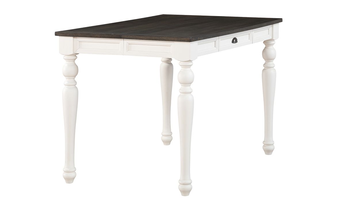 Get that charming, farmhouse-inspired look you’ve been lusting over without sacrificing modern conveniences with the Joanna Two-Tone Farmhouse Counter Height Dining Table. Crafted from hardwood solids and Acacia veneers, this 36-inch tall counter height table features a charming ivory picture frame apron and classic turned wood legs, as well as a single storage drawer with an apothecary-inspired cup handle. This drawer supplies a built-in storage spot to stow the table’s single 18-inch extension leaf, which allows the mocha plank-style top to expand from 36 to 54 inches wide, perfect for effortlessly accommodating gatherings small and large.