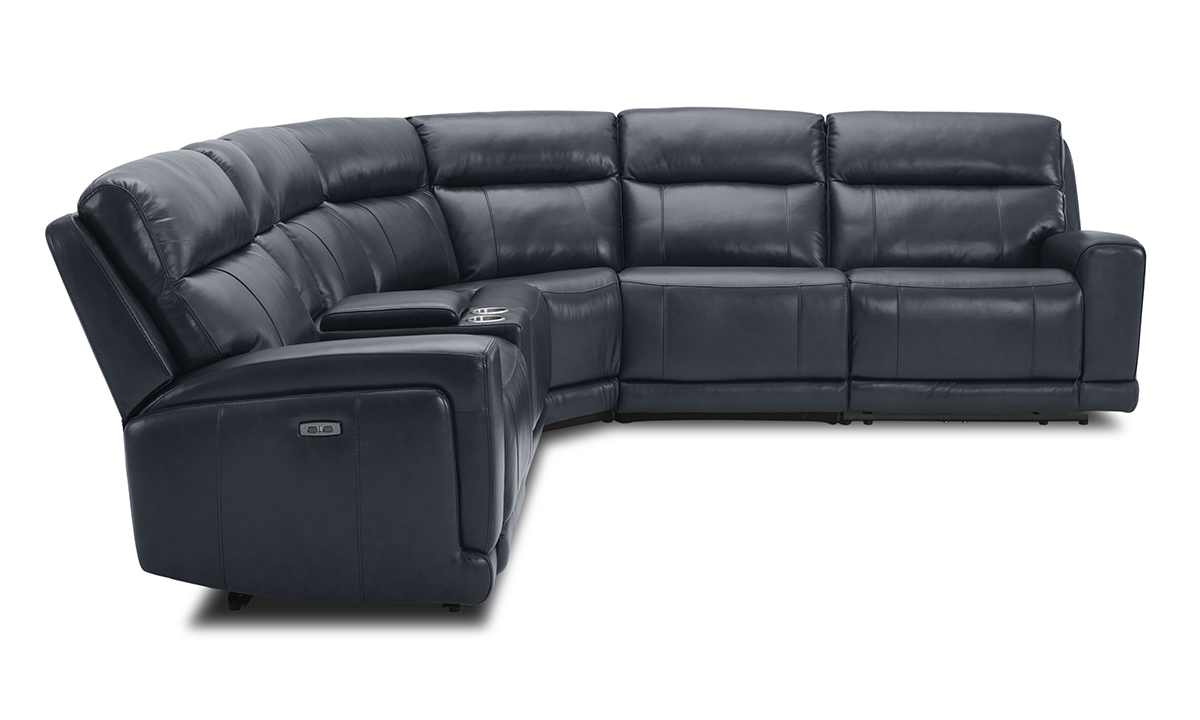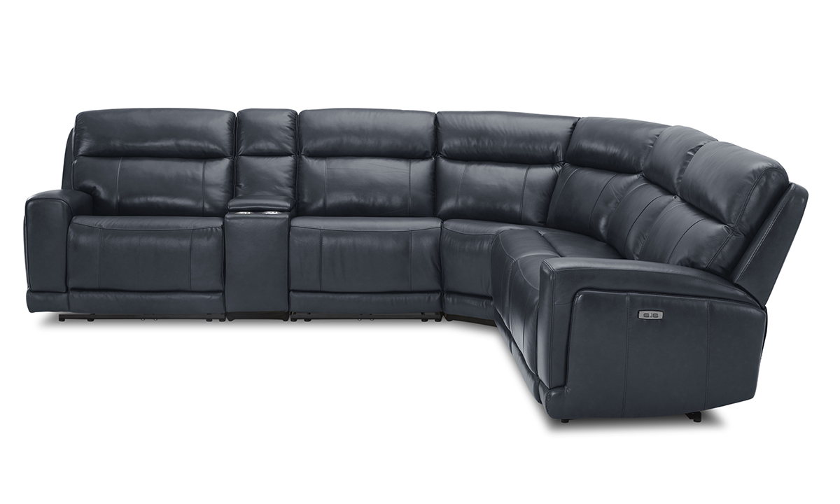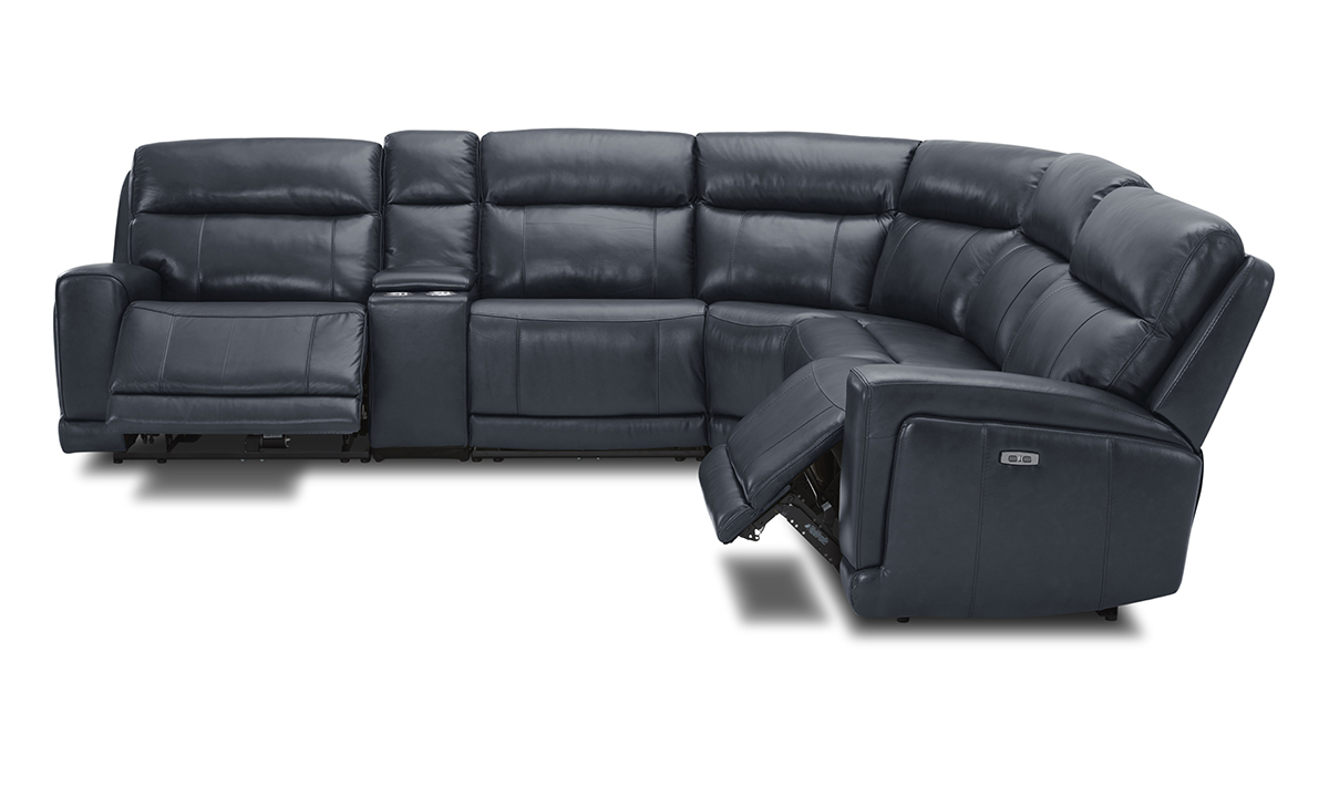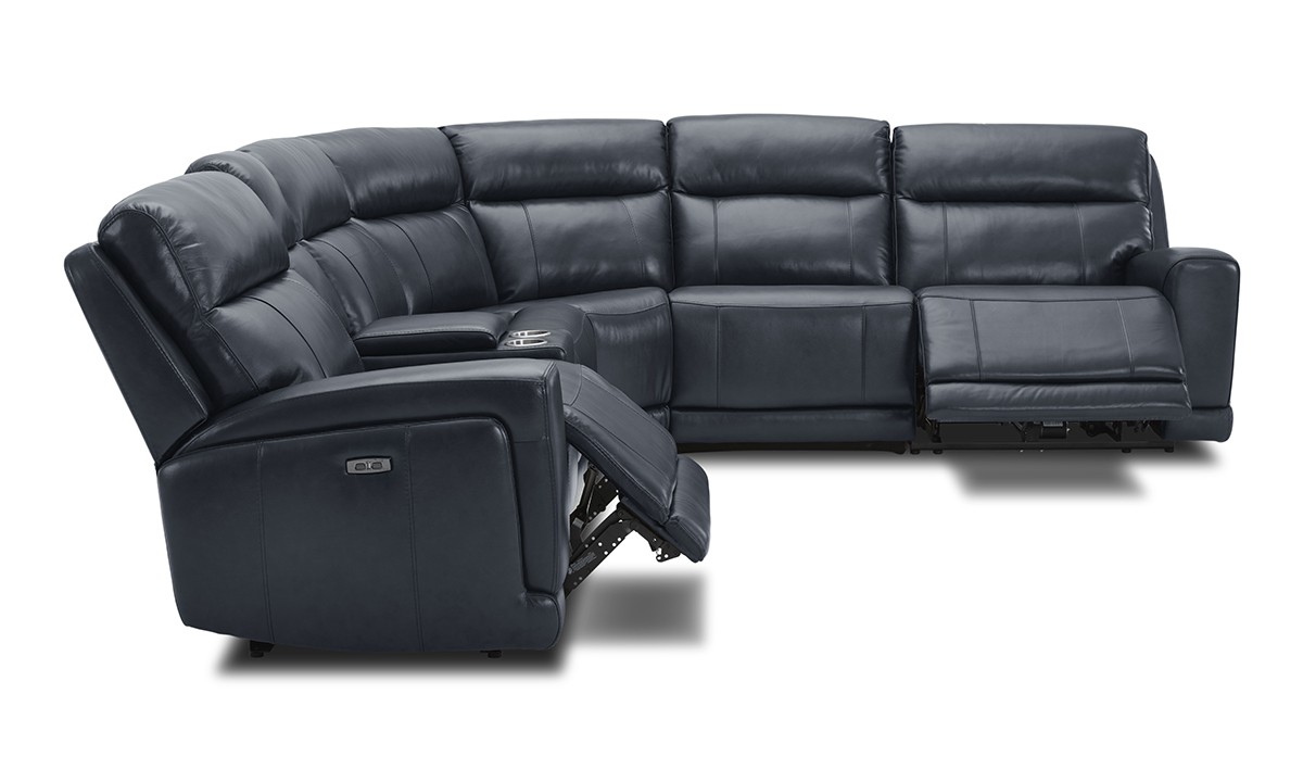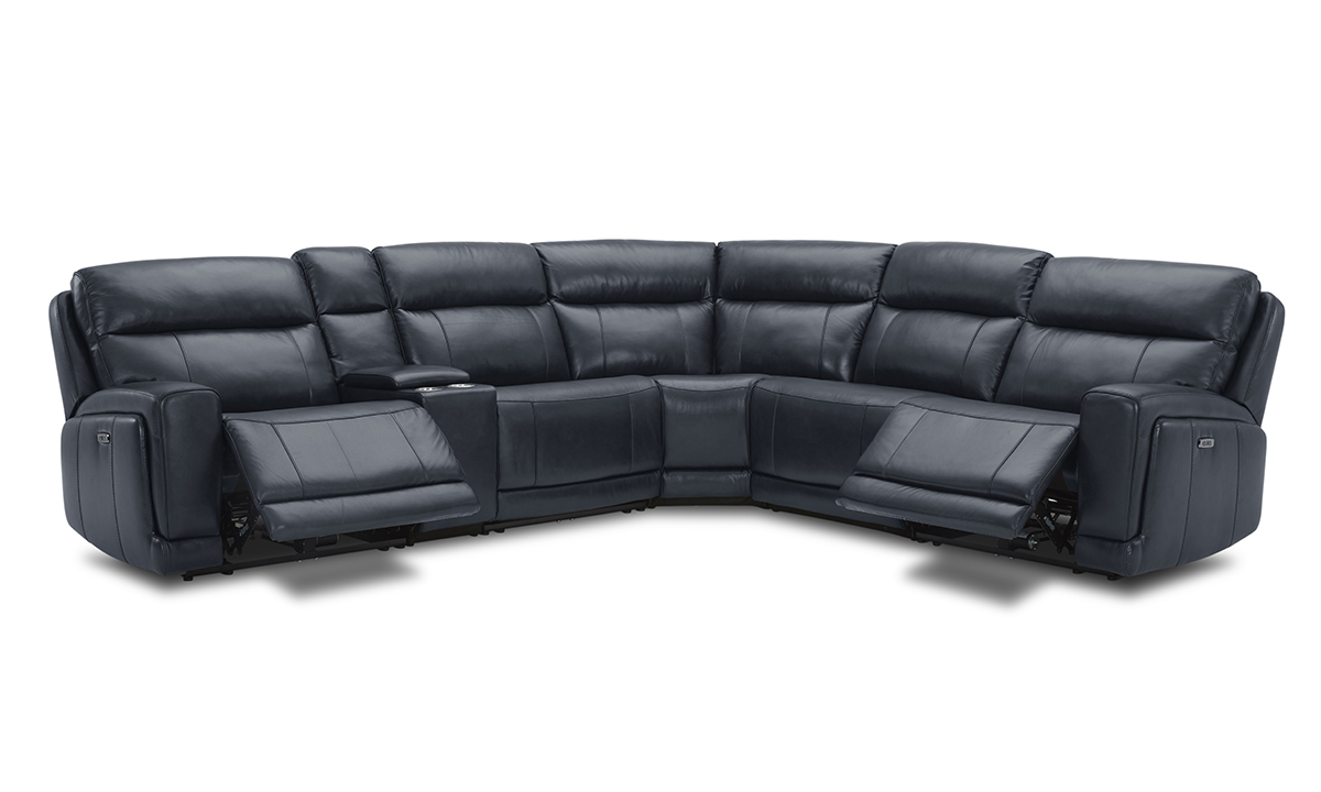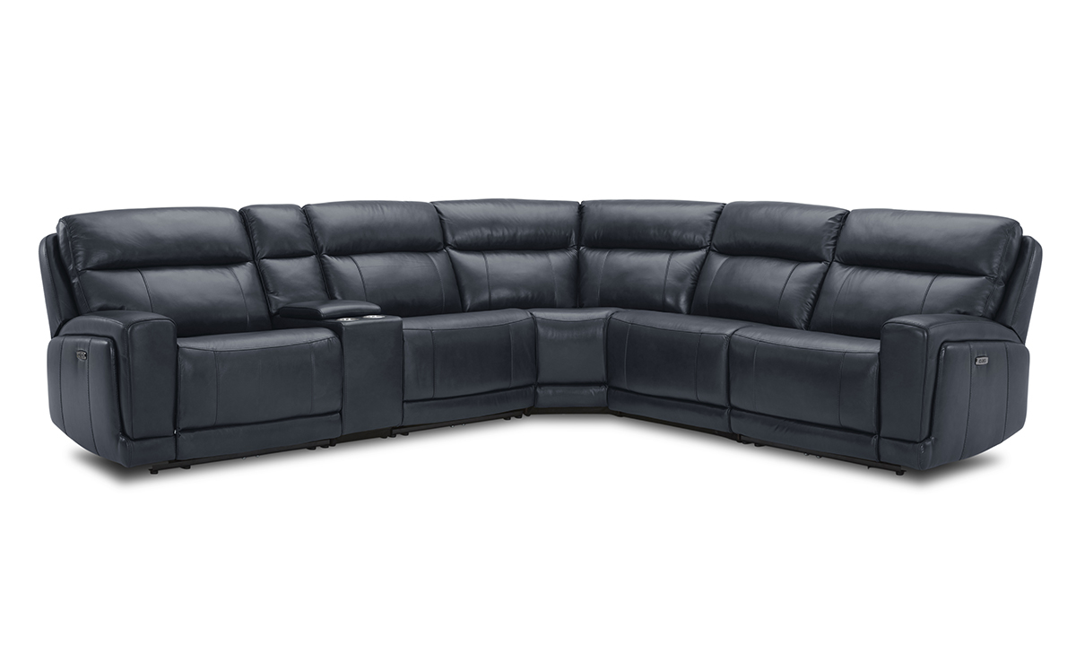 Upgrade your living room or entertainment space with the premium comfort and design of the Keller Navy Leather Power Reclining Sectional. Crafted to keep its shape and looks for years, this six-piece sectional is constructed with sturdy hardwood frames and sinuous spring support systems and then wrapped in plush high-density foam cushions. Supple navy blue top grain leather lends is expertly tailored to the sleek bustle back seats and track arm profile. Push button control panels allow you to customize your reclined and headrest positions in three of the five seats while a convenient storage console with power outlets, USB charging ports, storage and cupholders keeps all your relaxation essentials neatly organized.