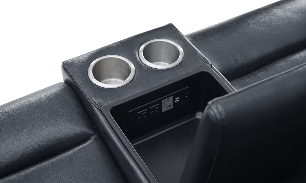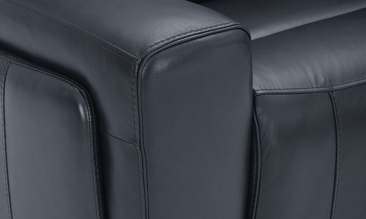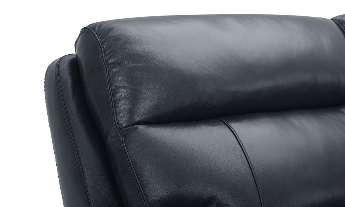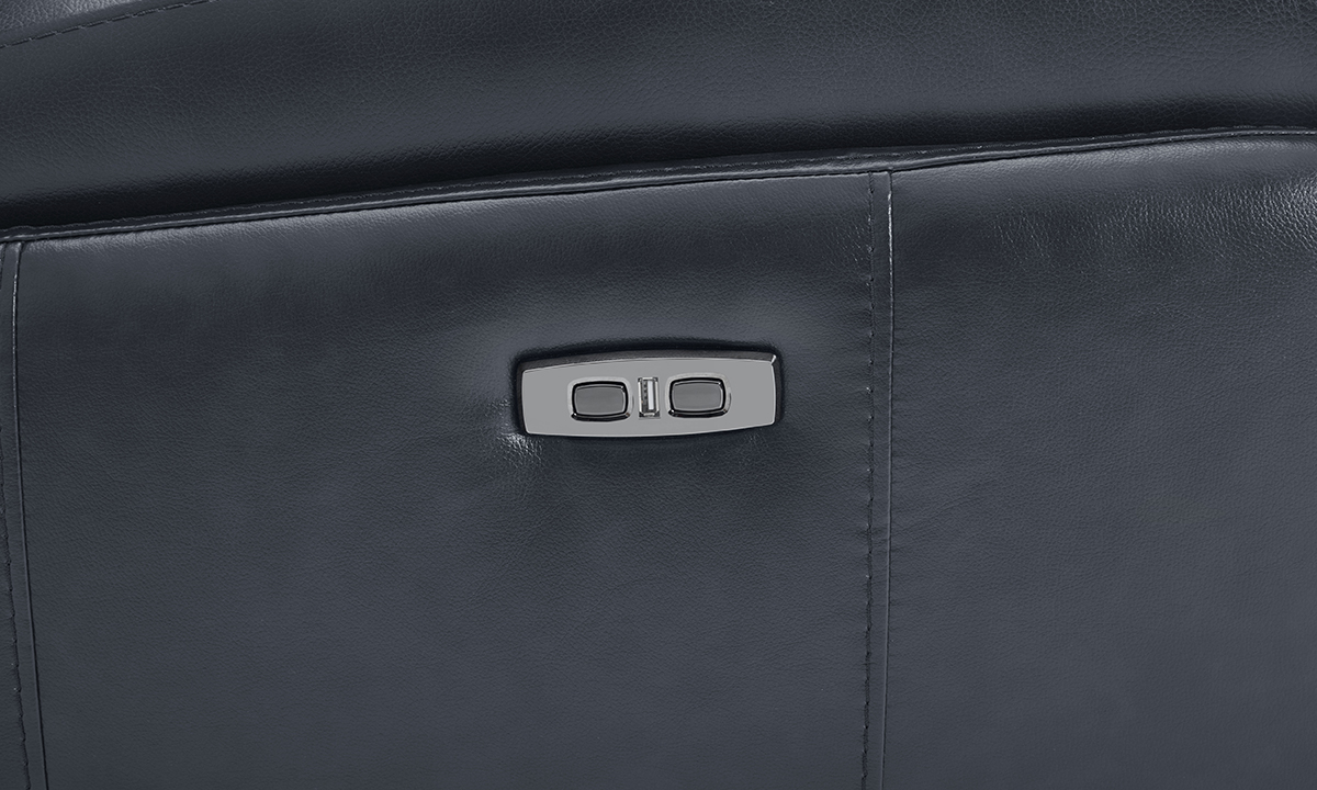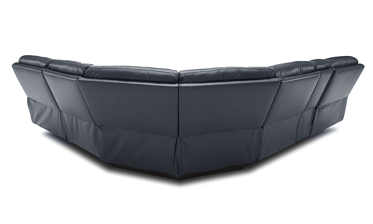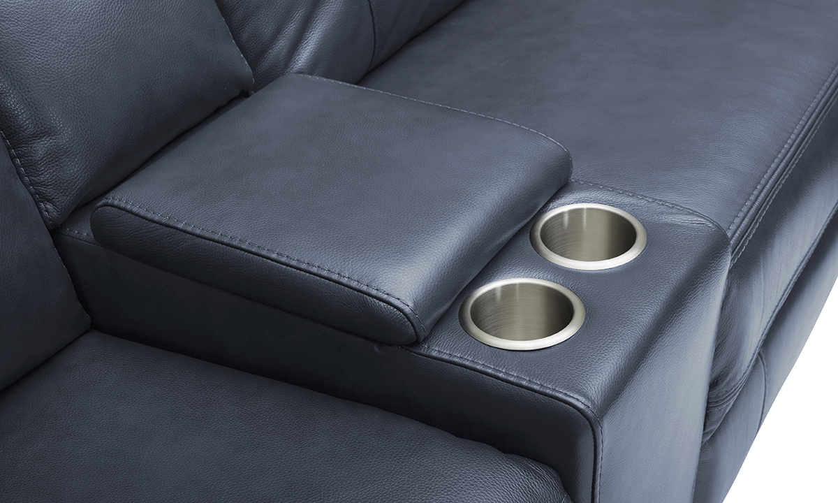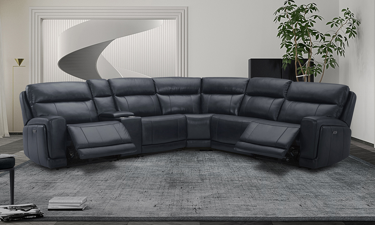 Upgrade your living room or entertainment space with the premium comfort and design of the Keller Navy Leather Power Reclining Sectional. Crafted to keep its shape and looks for years, this six-piece sectional is constructed with sturdy hardwood frames and sinuous spring support systems and then wrapped in plush high-density foam cushions. Supple navy blue top grain leather lends is expertly tailored to the sleek bustle back seats and track arm profile. Push button control panels allow you to customize your reclined and headrest positions in three of the five seats while a convenient storage console with power outlets, USB charging ports, storage and cupholders keeps all your relaxation essentials neatly organized.