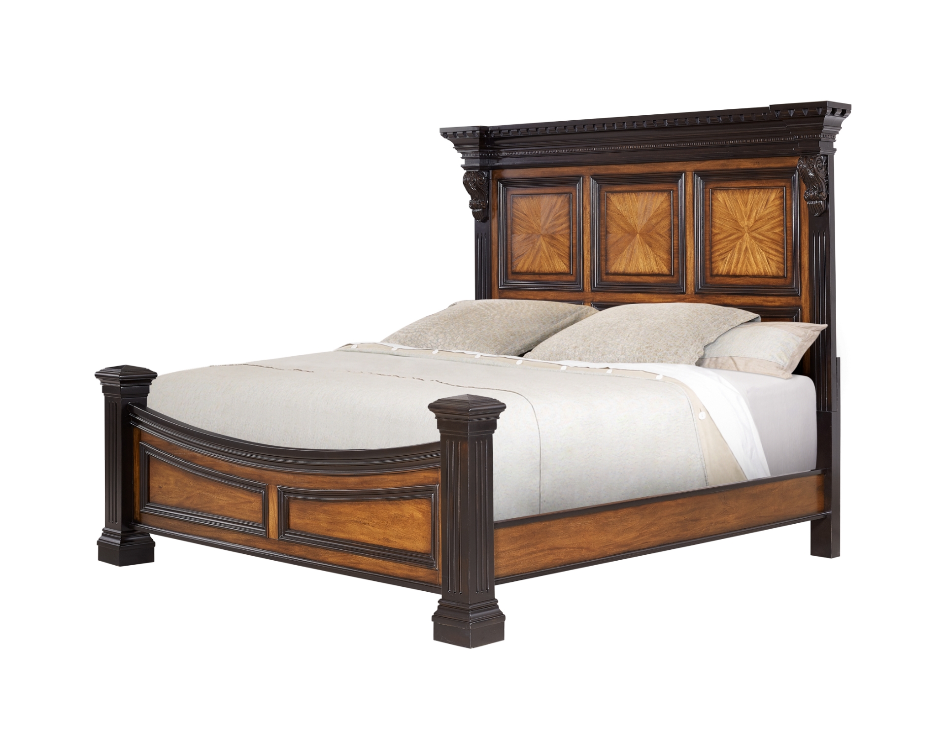 Elegant King panel bed crafted from Poplar and Ash hardwoods with ornate carvings in a dark cinnamon finish.