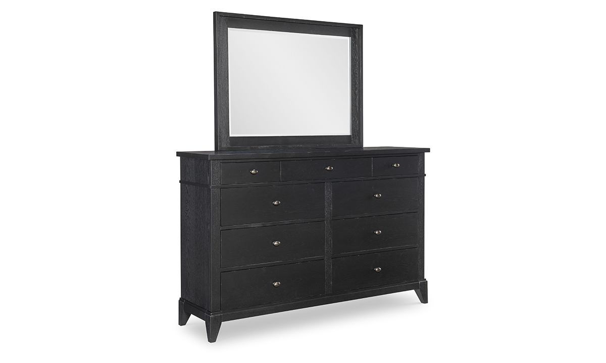 Elevate your bedroom with our stylish 9 Drawer Dresser. This piece features side-mounted metal ball bearing drawer guides for smooth operation, and English dovetail fronts and backs for durability. Made from premium hardwood solids and veneers, it boasts a sophisticated Blacksmith finish that complements any decor.. Find it now at our bedroom outlet.