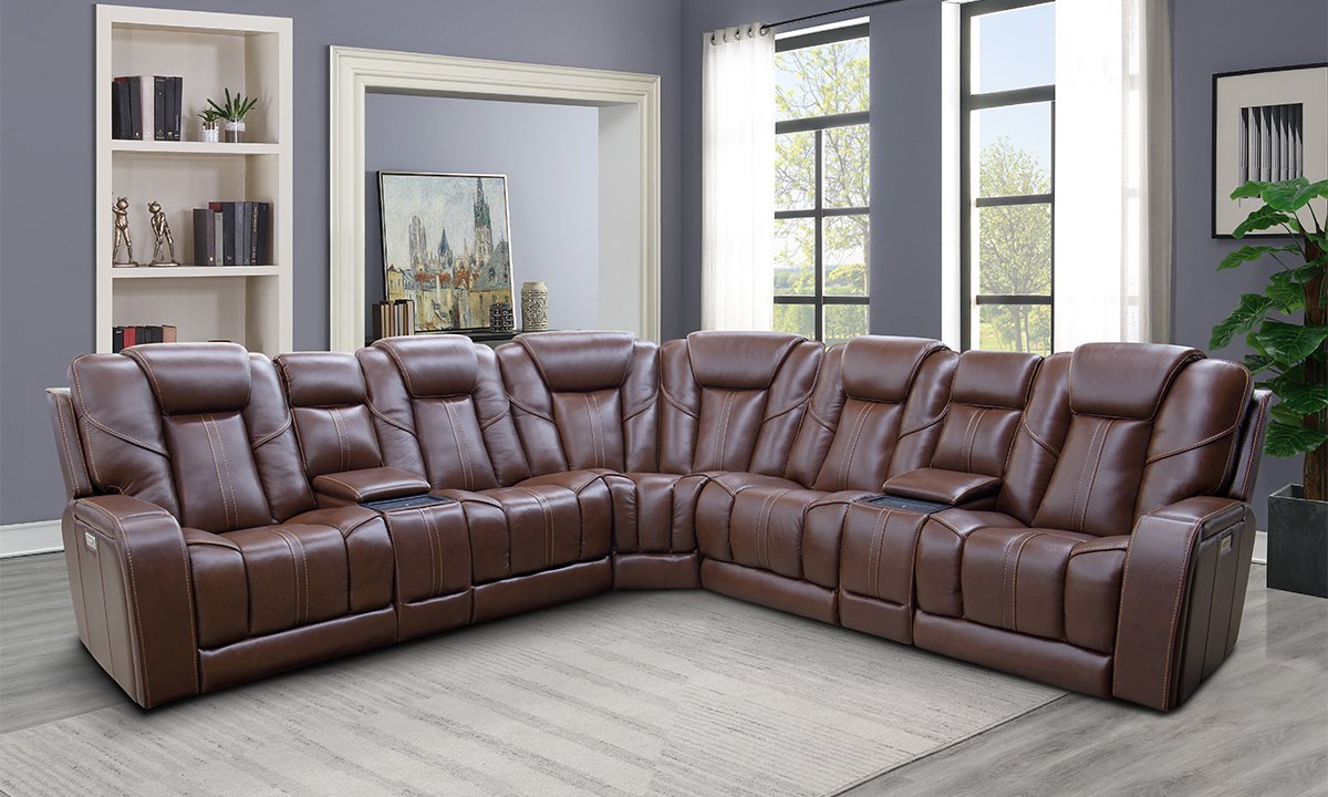 Introducing the luxurious Merlin Coffee top grain leather sofa, a 7-piece sectional featuring power recliners, headrests, lumbar support, and multimedia consoles with wireless charging for ultimate comfort.