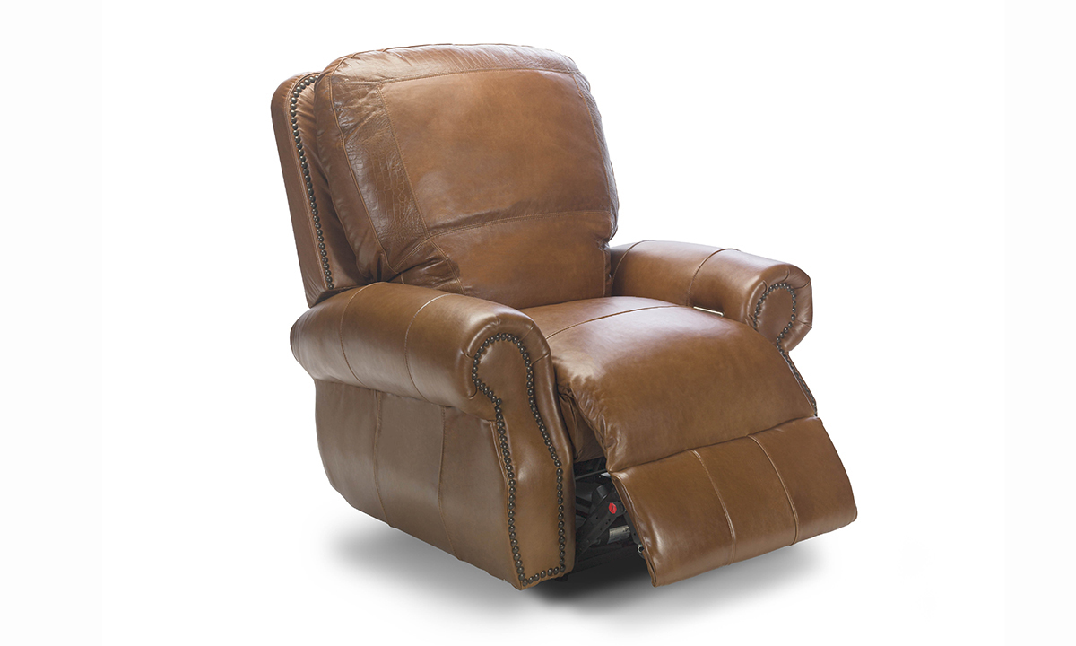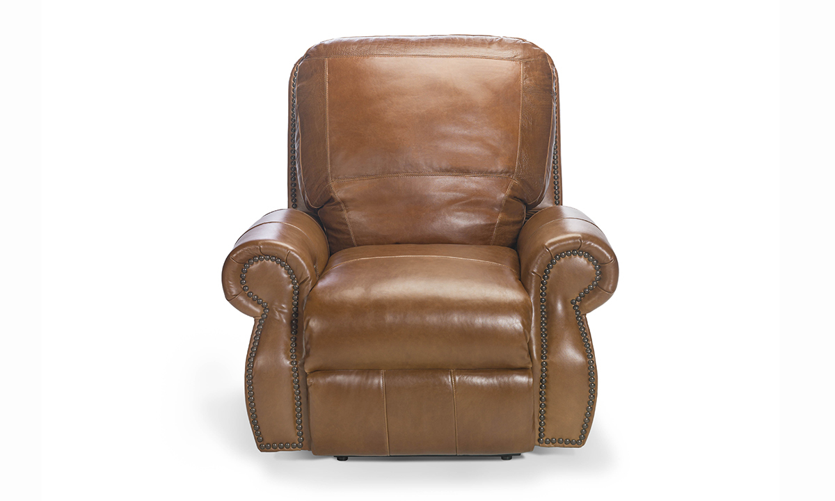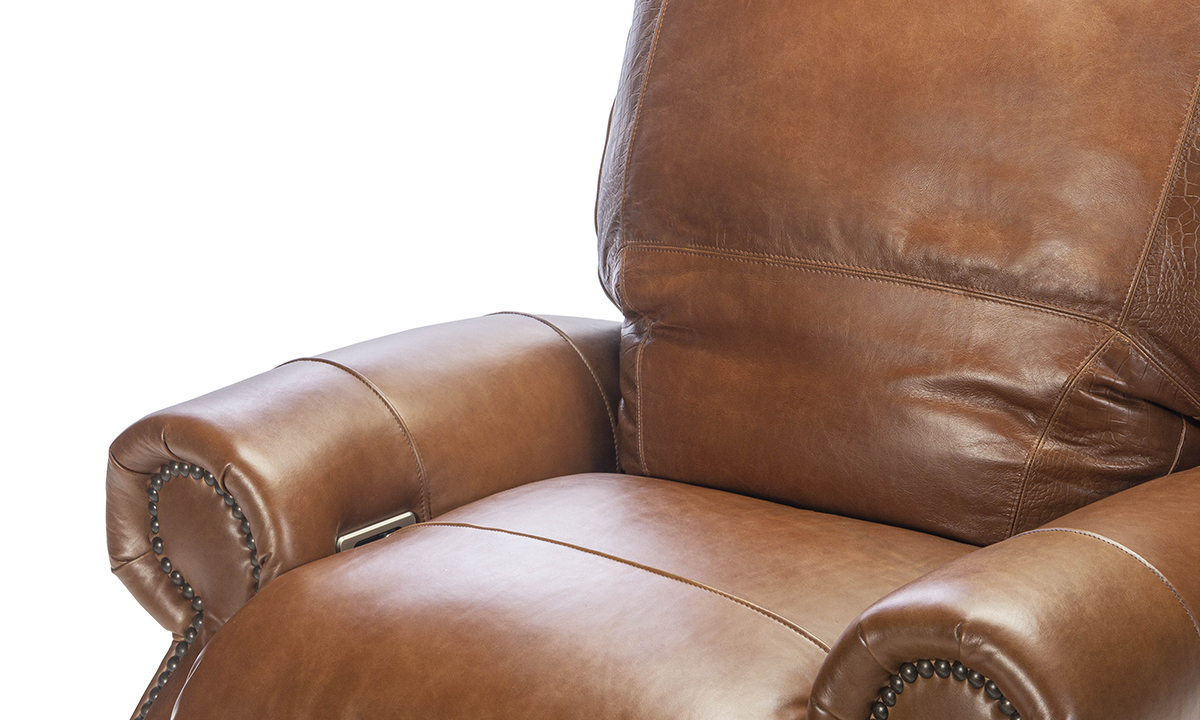 Classic power recliner sports a wild twist with alligator embossed top grain leather tailored in timeless nail head trim with feather down blend cushion toppers for ultra luxurious comfort.