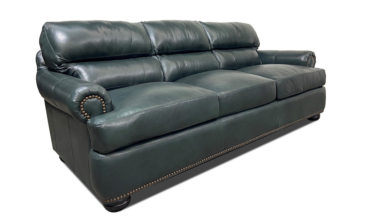 Experience sophistication with the Wintergreen Leather Sofa, featuring Hunter Green top grain leather, plush down-blend cushions, and elegant nailhead trim, designed for lasting comfort and style.