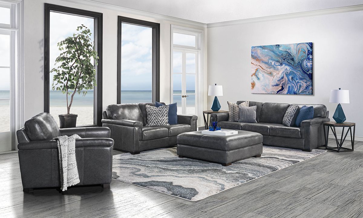 The Medici Leather Collection is available in Chestnut brown and Grey colorways. Choose from the sofa, loveseat, armchair and ottoman of the living room sets, browse our twelve most popular sectional configurations or create your own for a completely custom look.