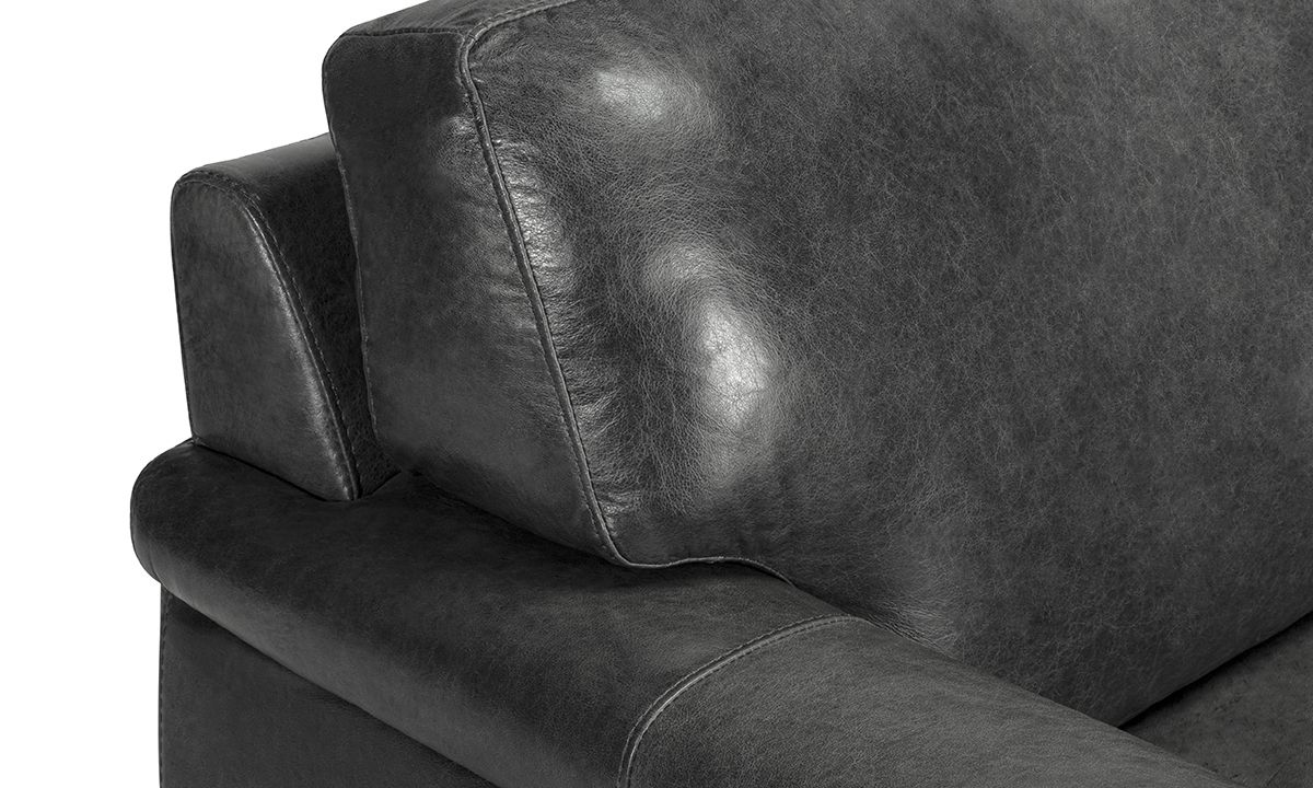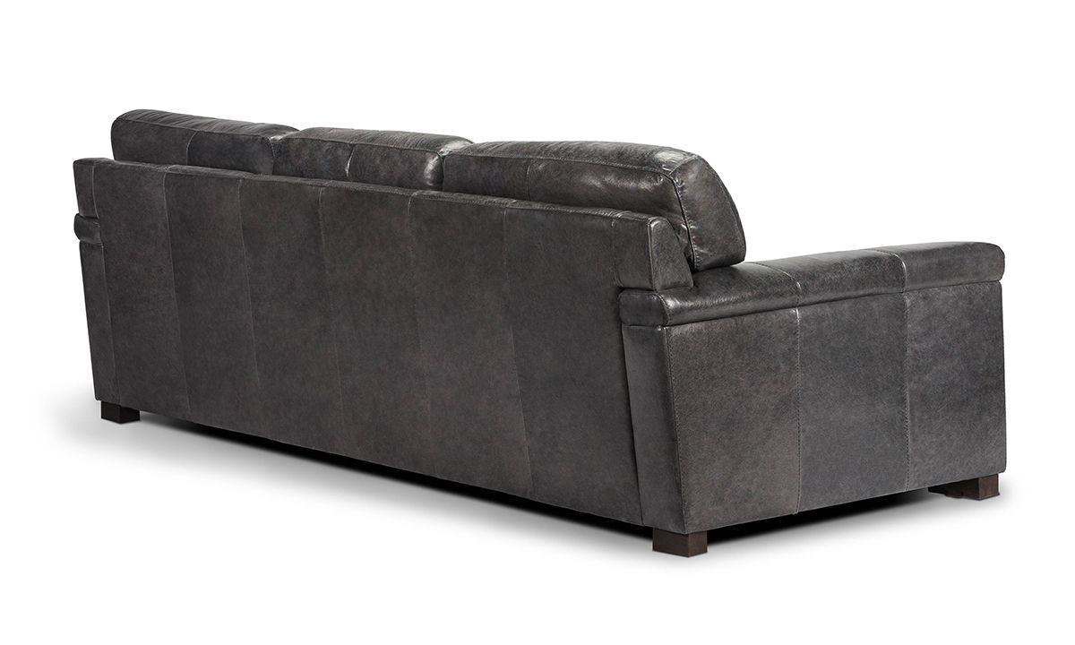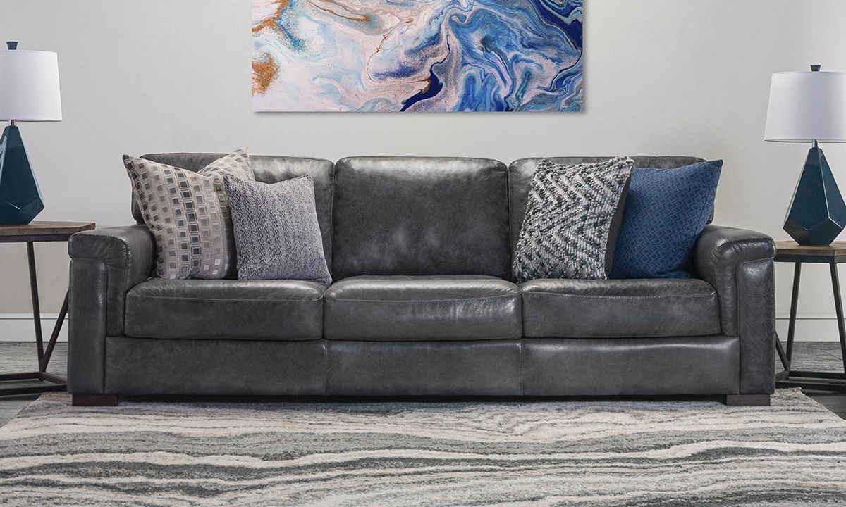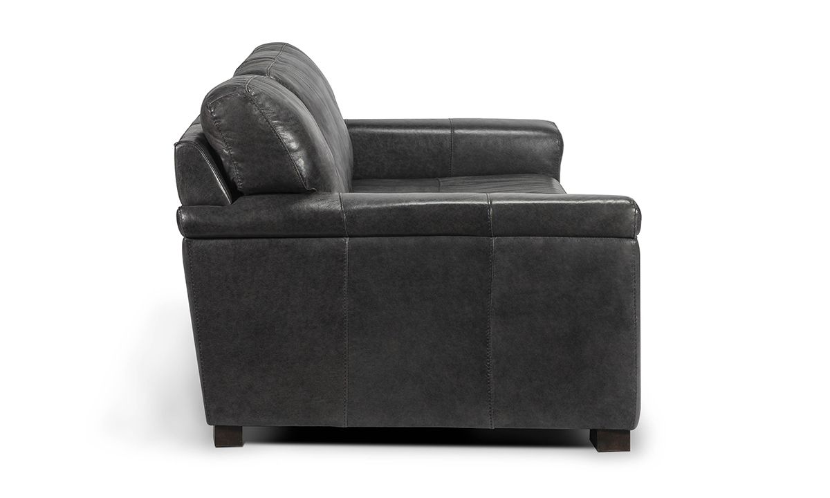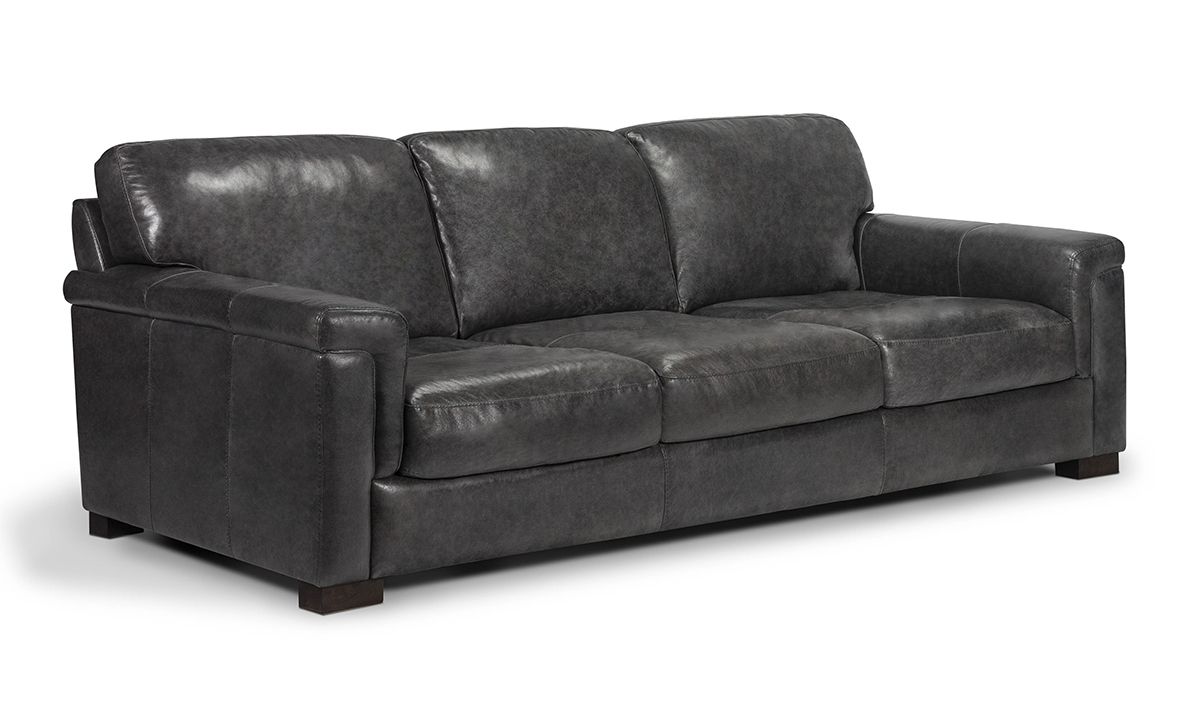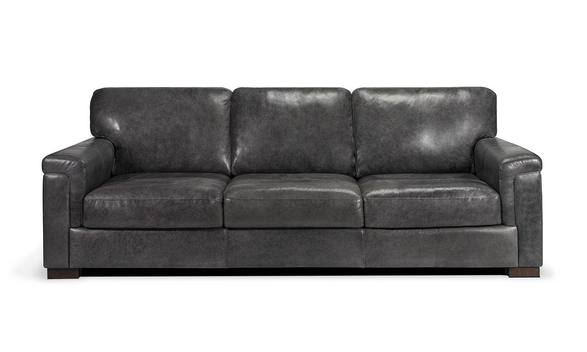 Comfortable and stunningly handsome, the Medici Gray Leather Sofa will instantly elevate the character and style of any living space. Carefully handcrafted in Italy for utmost durability, this oversized 98-inch-wide sofa starts with a solid hardwood frame and Pirelli webbed support system, which are then completely enveloped in all over foam padding and topped with plush, high-density foam cushions. Buttery soft top grain Italian leather is hand-tailored to the contemporary, low-slung profile, distinguished by unique layover armrests, distinctive stitching accents and irresistibly deep seats. Softening the modern design, the calming dark gray leather color captures the luxe look and feel of premium top grain leather to give the piece a lasting beauty that will only get better with everyday wear and age.