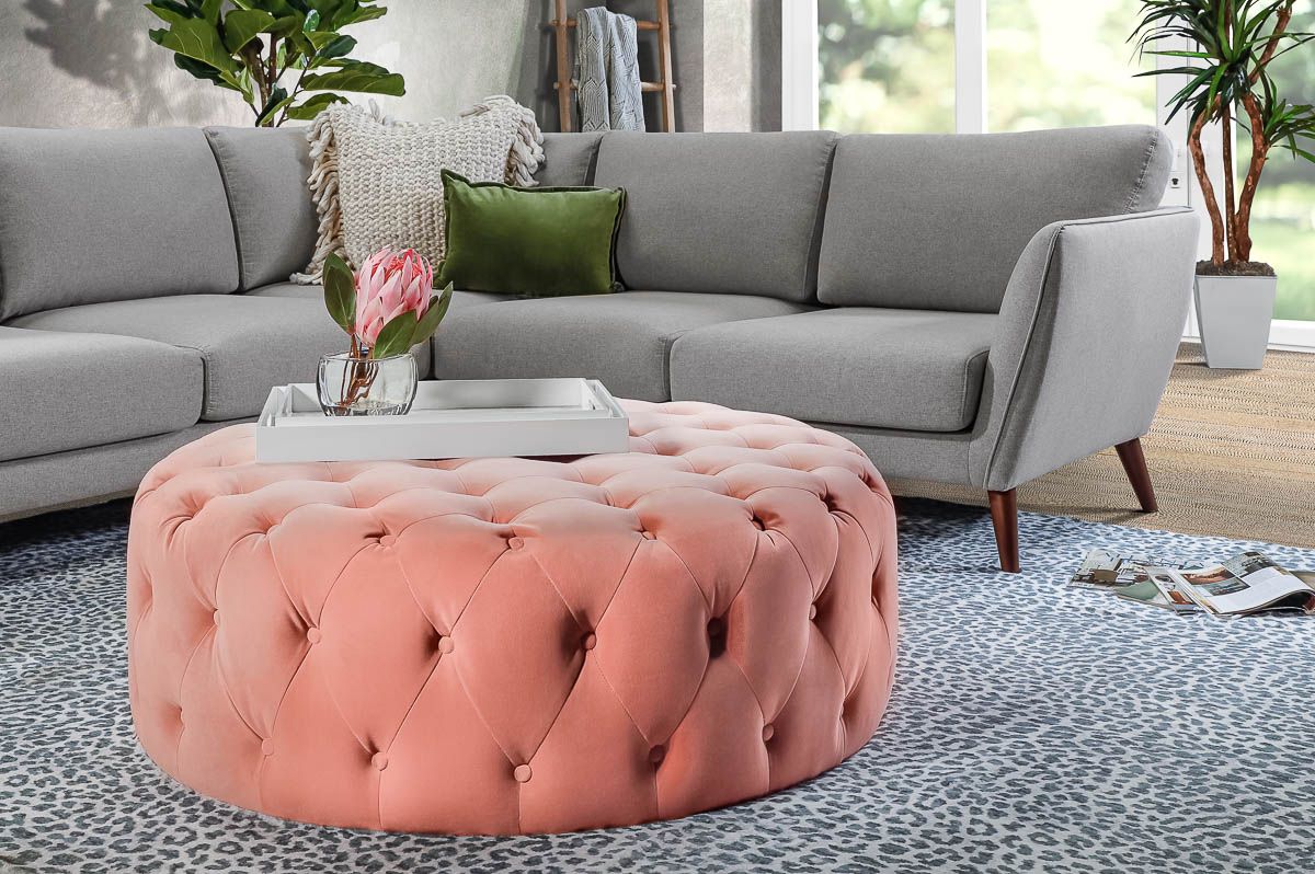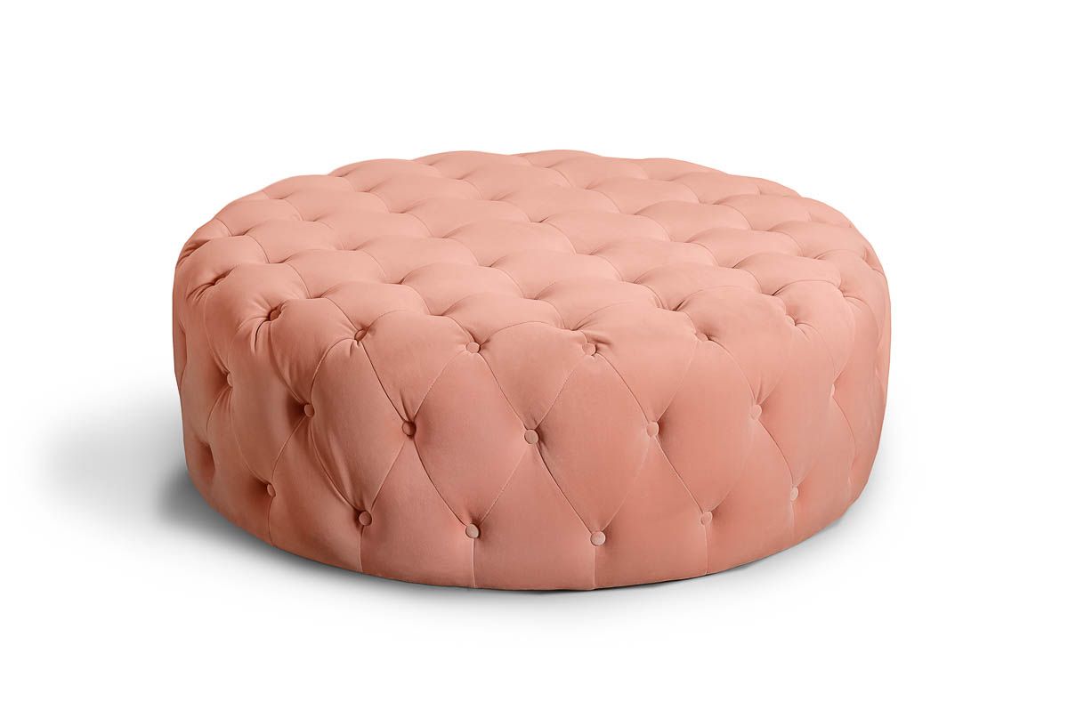 As an inventive cocktail table beneath a chic tray or sweet extra seat in a living room or bedroom, the Melrose Blush Tufted Ottoman lends a posh pop of color and style to any space. Invoking old Hollywood glamor with its rounded shape and deep button-tufted accents, this oversized 42-inch round ottoman gets a fresh new look in chic blush pink velvet fabric. Crafted to last, this ottoman is made with a solid hardwood frame and plush high-density foam cushions.