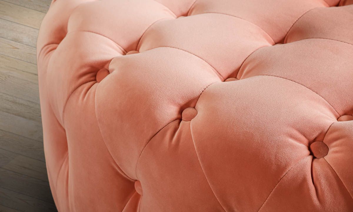 Glam ottoman features traditional button-tufted tailoring with hidden casters on luxe blush pink velvet fabric upholstery.