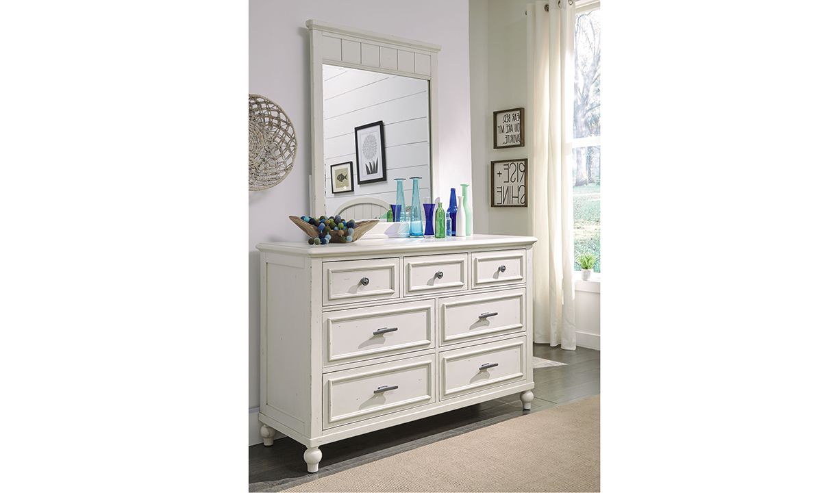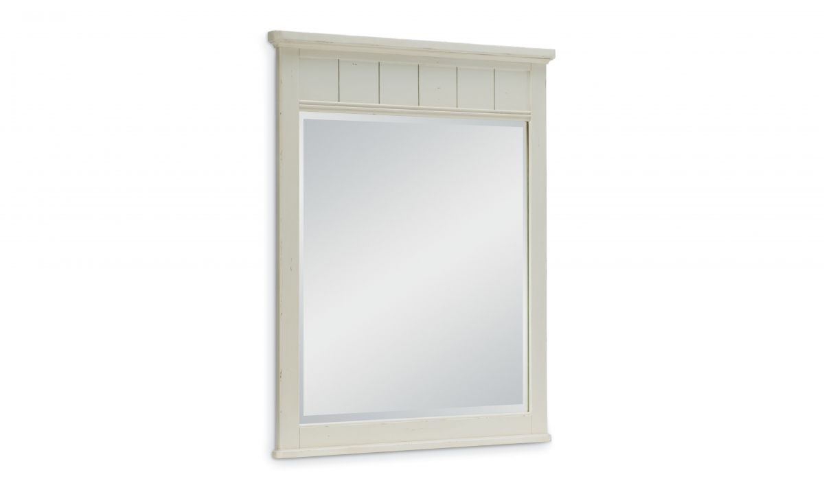 Cottage-inspired vertical mirror features a lightly distressed Pebble White finish and can be hung on a wall as a decorative accent piece or attached to the matching dresser.