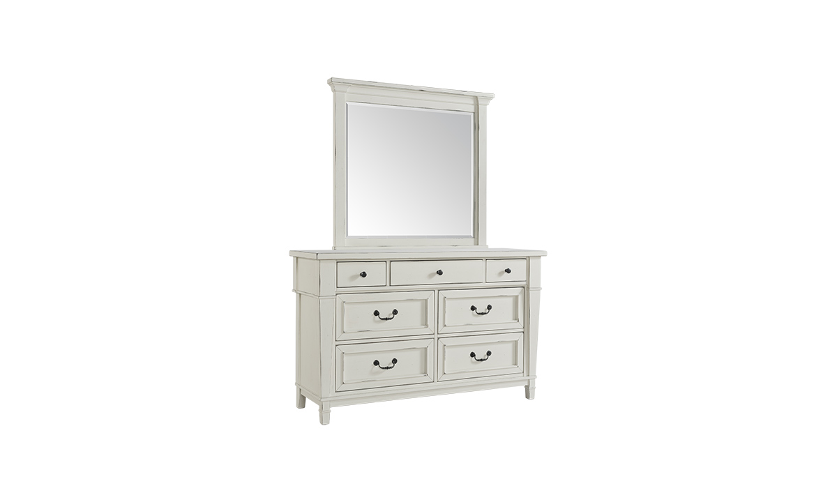 Add a touch of charm to your space with the Northport White Mirror, a perfect piece of mirror for bedroom. Made from poplar solids with a stone white finish and veneer, this mirror features beveled glass set in a crown molding frame, adding a modern farmhouse charm to your decor. Designed to complement the Northport youth bedroom collection, it complements any room with its large-scale, elegant design and textured, antique white finish.