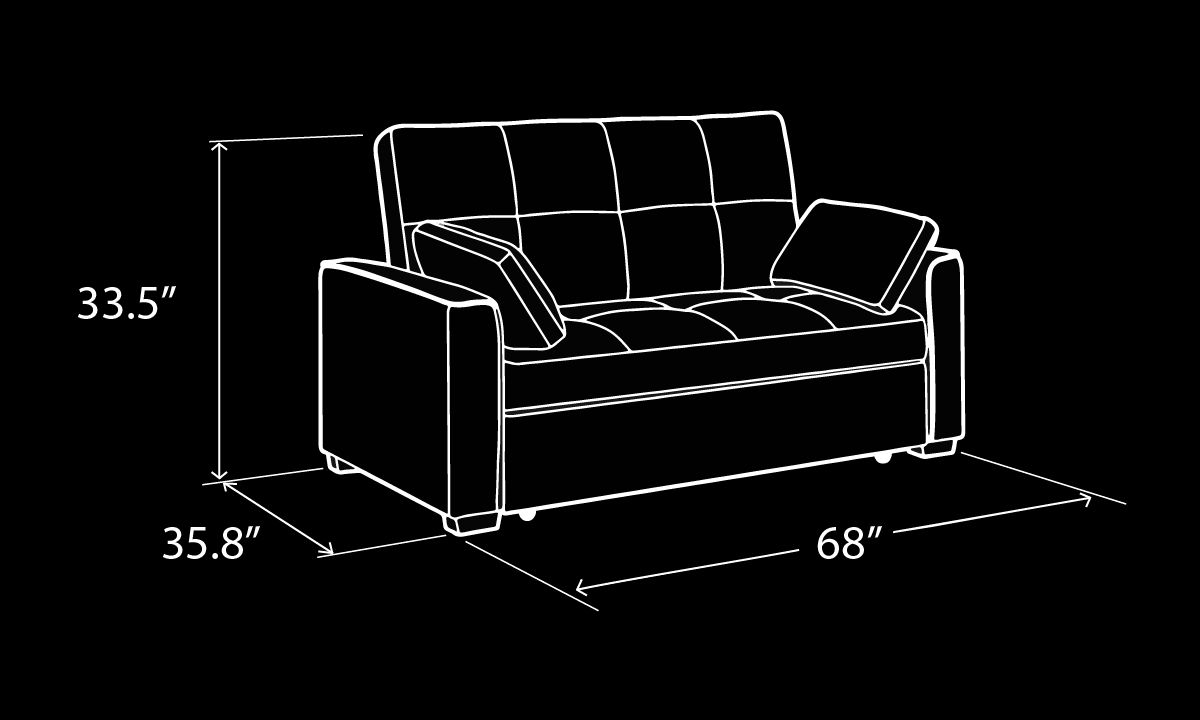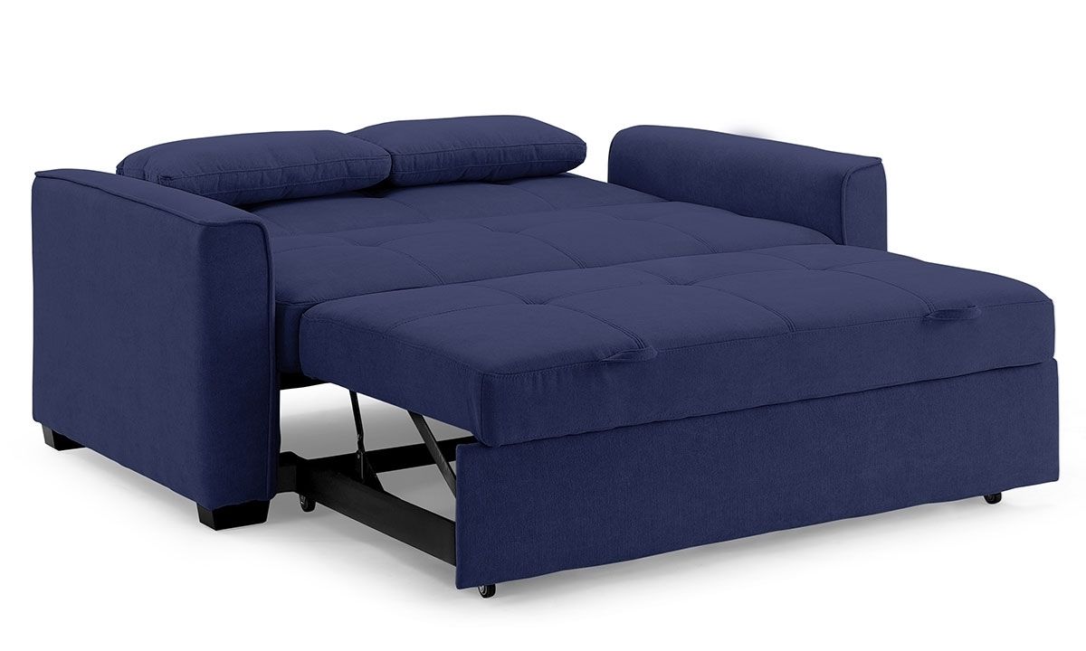 Form, function and fun await when you add the Nantucket sleeper loveseat to your living space. Encompassed within the contemporary silhouette of this loveseat is the pocket-coil innerspring support system wrapped in high-density foam cushions and soft, easy-clean navy blue micro-suede upholstery. Clean, angular lines and stylish tufting define the look of this polished piece and conceal the hidden sleeper functionality, which can be easily accessed by the two pull handles at front and slide forward to reveal a cushioned platform that pops up and sits flush with the existing seat cushion. The loveseat back also reclines backward into a lounging position for optimal TV viewing or comfortable reading and lays flat to create a full-size bed with the pop-up platform. Perfect for sprawling out during movie nights or accommodating overnight guests, this loveseat is a clever, appealing addition to any space.