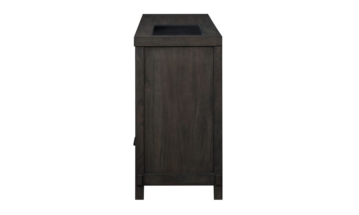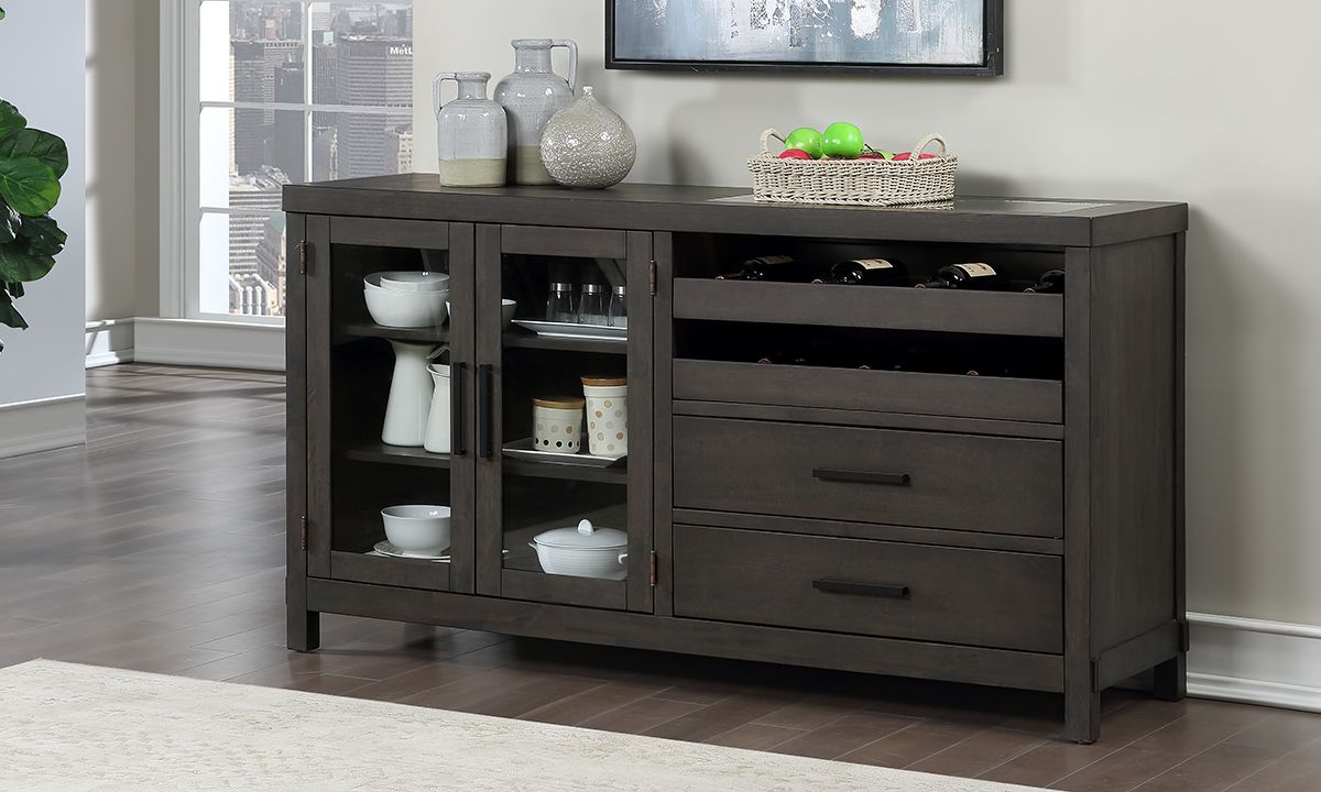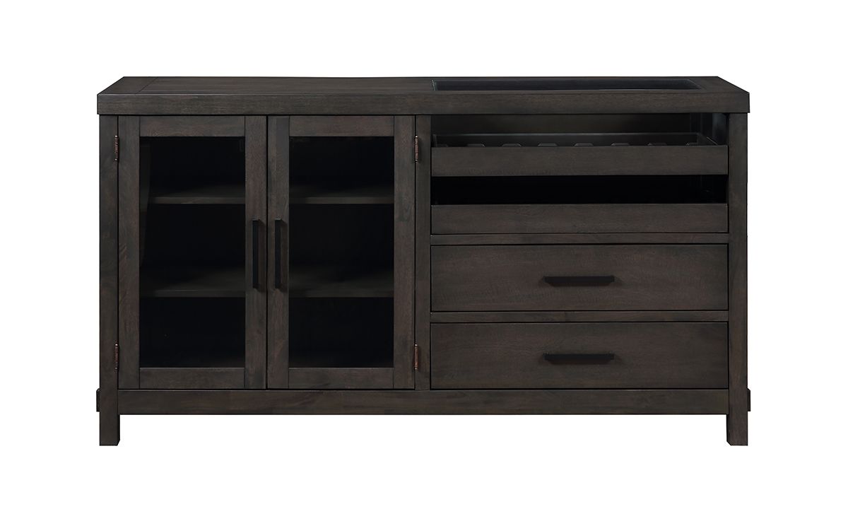 Multi-functional server includes a glass-front cabinet, two storage drawers and two shelves with removable bottle rack inserts in a rustic Dusky Cedar wood finish.
