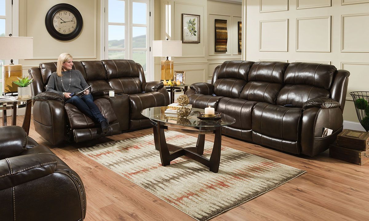 Find dual power recliners with power headrest and lumbar controls encased in a rich, Walnut brown top grain leather in this sleek reclining sofa.