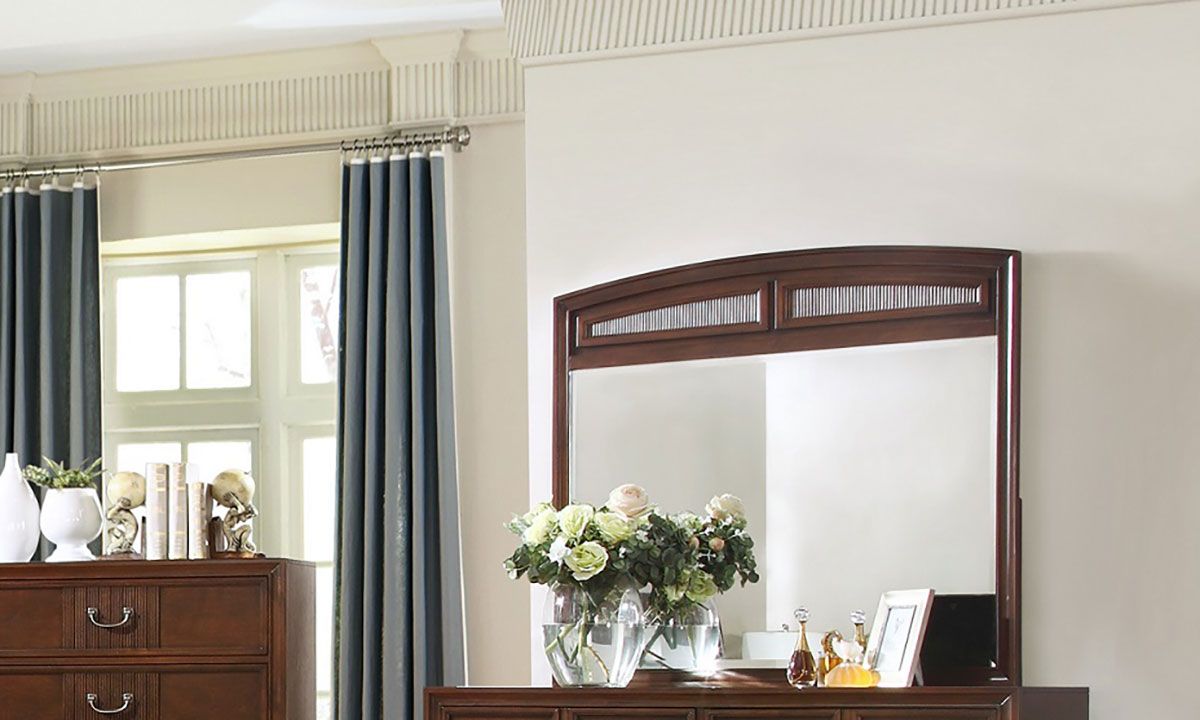 Hung on a wall as a versatile accent piece or affixed to the coordinating Parkhurst Cherry 8-Drawer Dresser, the Parkhurst Cherry Landscape Mirror elevates the décor of any living space. Perfect in the bedroom, hall or as living room décor, this versatile 42-inch wide beveled glass mirror is finished with a Birch veneer frame in a rich, Dark Cherry finish. The gently arched top with decorative reeded accents lends unexpected detailing to the classic piece.