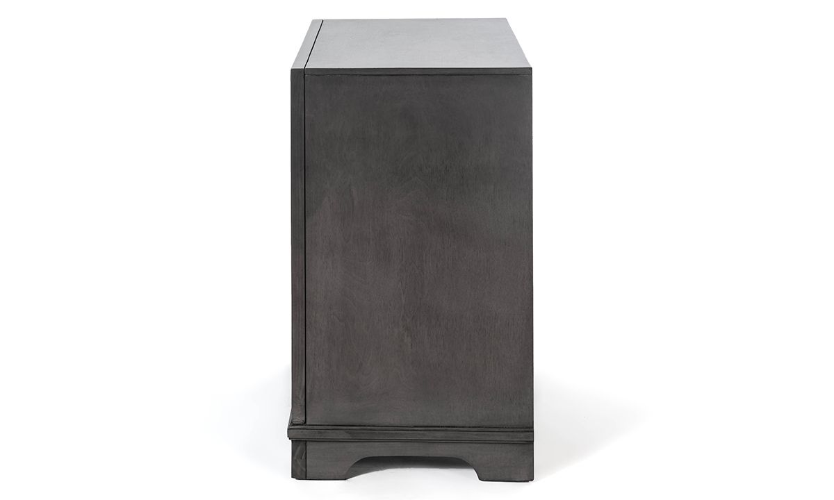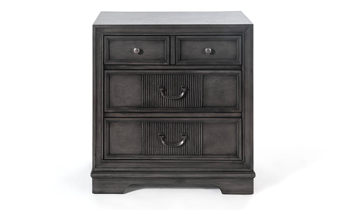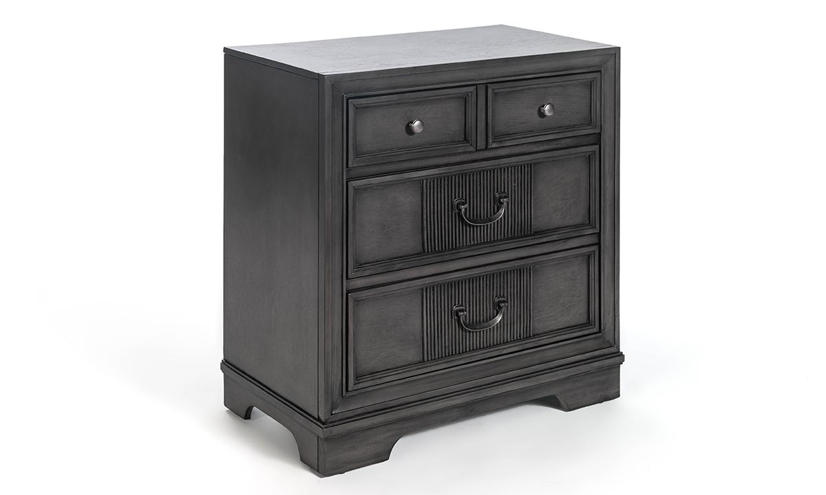 Whether you are adding to an existing suite or completing the Parkhurst bedroom collection, the Parkhurst Grey Reeded 3-Drawer Nightstand will bring ample storage and timeless style to your living space. Crafted with striking Birch veneers in a soothing Platinum Grey finish, the traditional, bracket-foot silhouette of this compact nightstand features unexpected reeded front accents behind the classic bail-pull hardware. The three spacious full-extension storage drawers help keep bedtime essentials concealed and conveniently close-at-hand.
