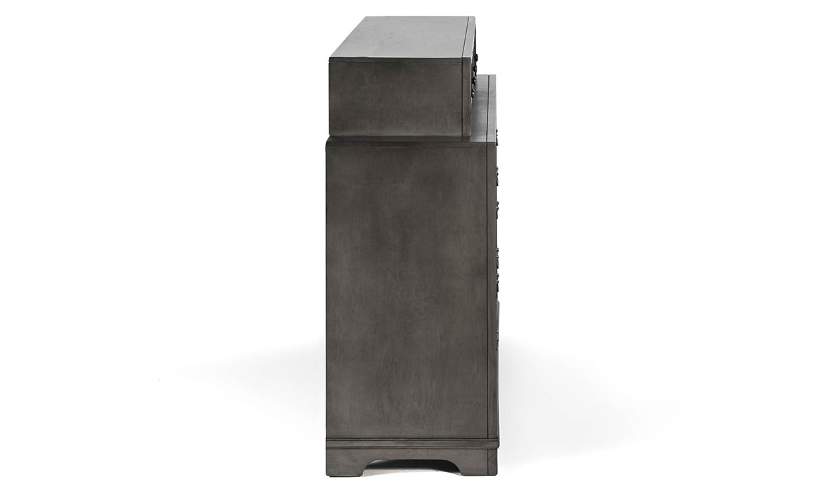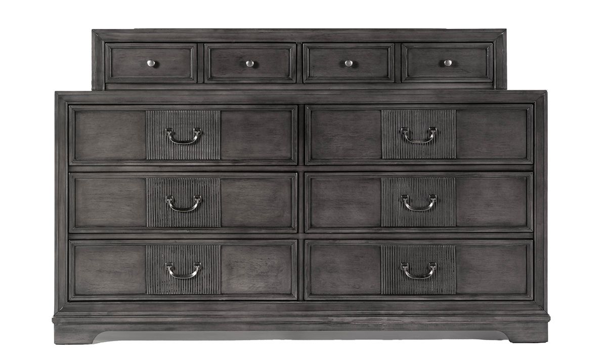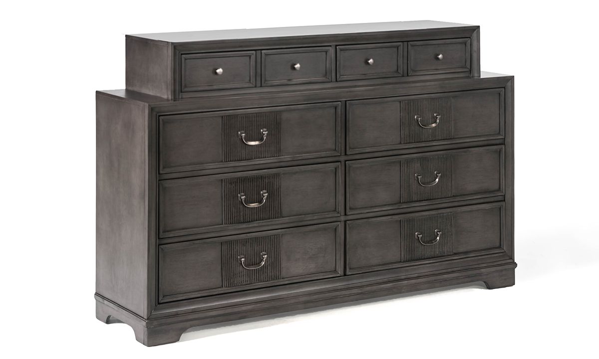 Upgrade your existing bedroom suite with the timeless style and ample storage of the Parkhurst Grey Reeded 8-Drawer Dresser. A warm, Platinum Grey wood finish adds understated elegance to the traditional, chest-on-chest style dresser while the reeded accents on the central drawer fronts lend unexpected embellishments to the streamlined silhouette. The eight spacious storage drawers feature full-extension drawer guides, with built-in interior dividers in the upper two drawers for added organizational convenience.