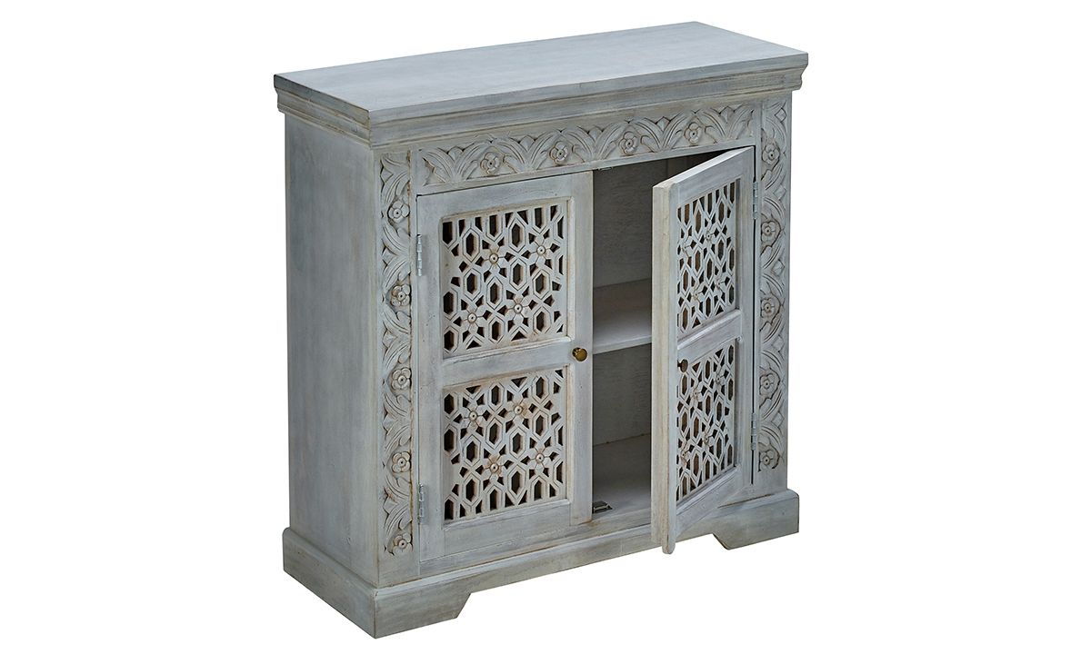 Made in India, this work of art features carved lace solid mango wood and whitewash finish. Details you’ll love include iron hardware, open, concealed fixed shelves, two doors and cord management.