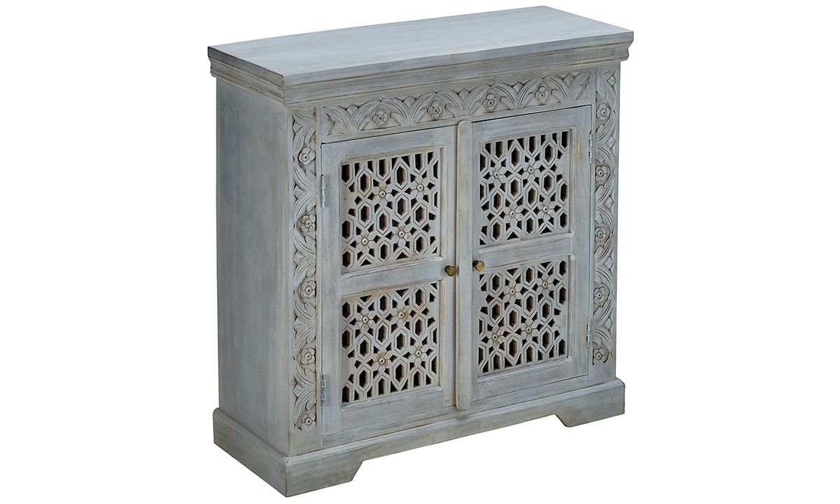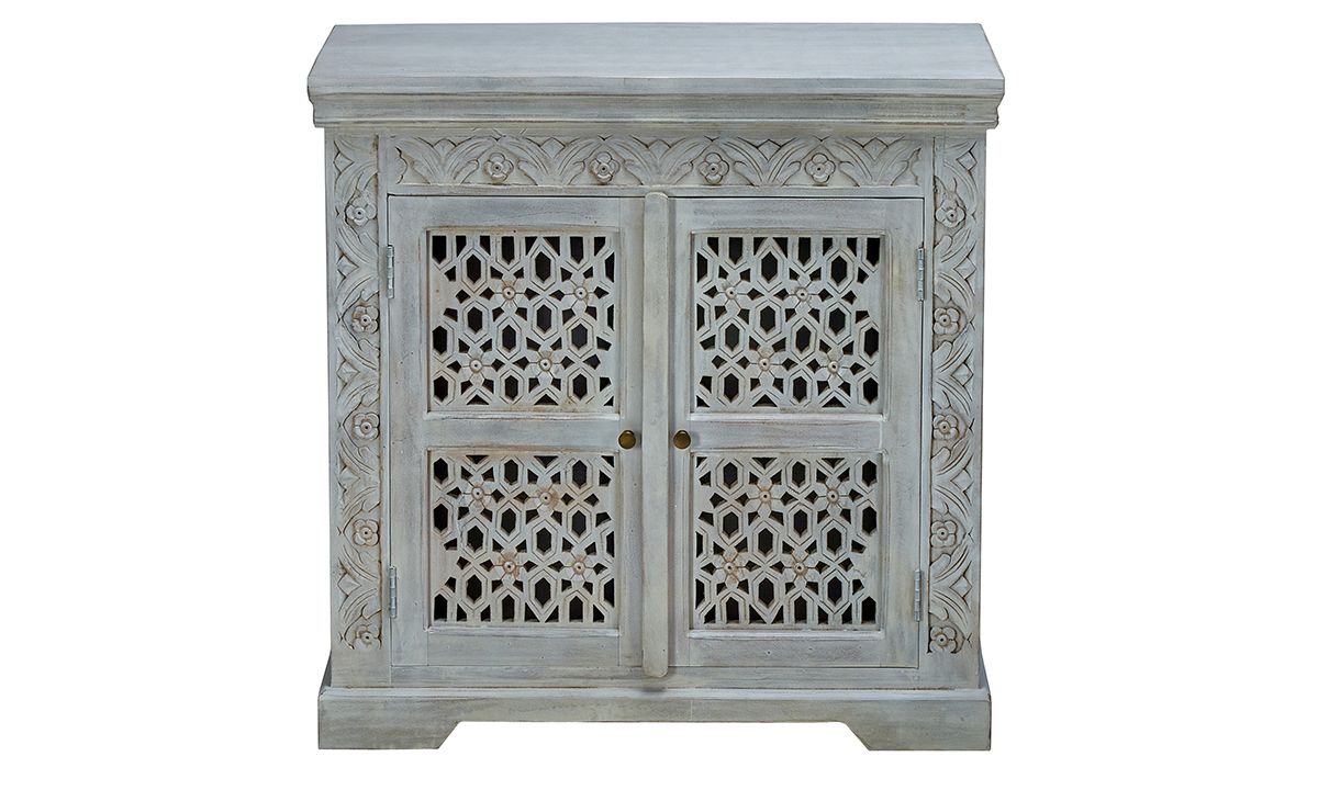 Art & craft meets stylish storage in this hand-carved solid mango wood cabinet with grey finish featuring brass knobs, two doors with interior shelf and tongue and groove joinery for lasting value.
