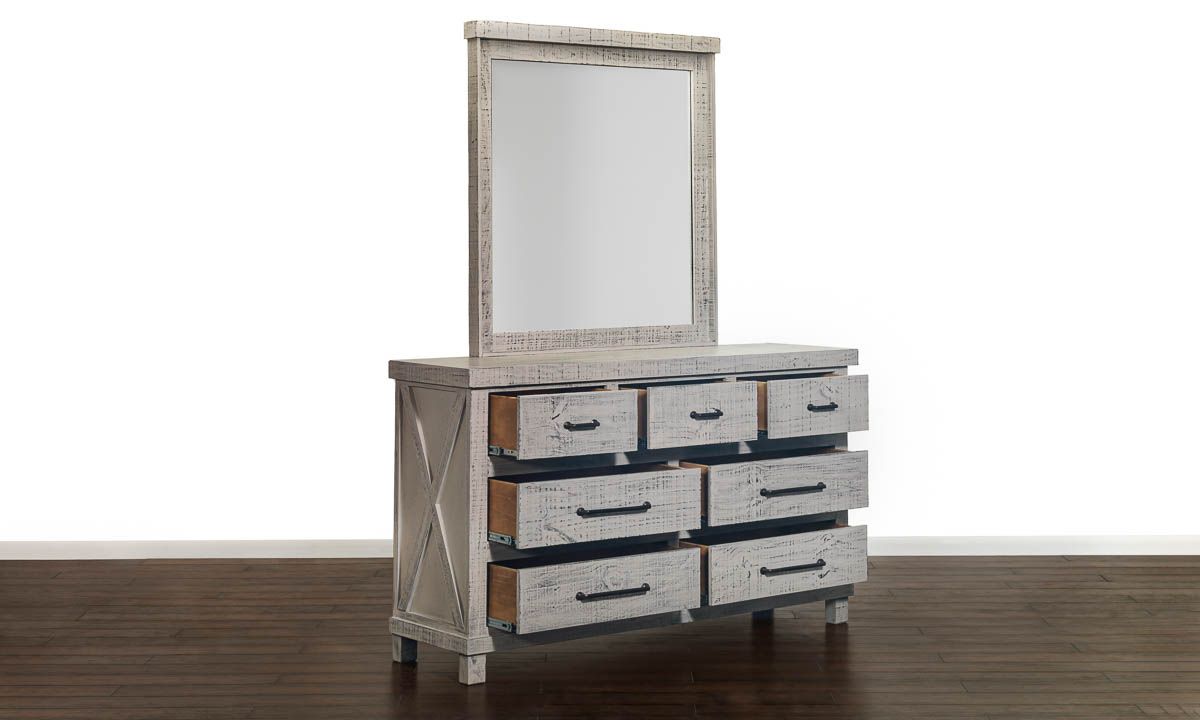 A modern bedroom suite with hand-carved craftsmanship. The complete Industrial set is featured in Brazilian pine with smoke gray finish and includes king bed, 7-drawer dresser, headboard, footboard and rails.