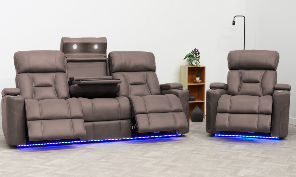 Discover the Oracle Brown Power Sofa, upholstered in Teramo Brown 100% polyester leather-look fabric. Features include power recline, power headrest, drop-down table with lights, Bluetooth speakers, cupholders, AC outlets, USB ports, and arm storage.