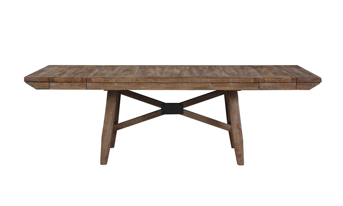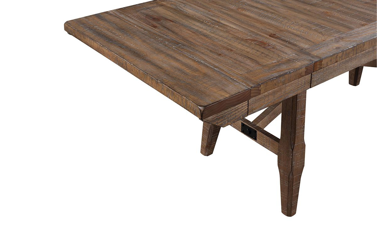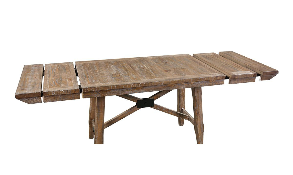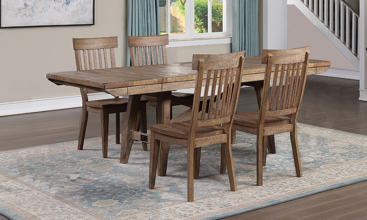 A fresh, modern take on heirloom-inspired design, the Riverdale Driftwood 5-Piece Dining Set makes the perfect centerpiece to your casual dining room ensemble. Crafted from Pine solids and weathered Pine veneers, the 72-inch table and four wooden side chairs boast a contemporary driftwood finish accentuated by saw-rasping distressing details. Perfect for effortlessly adapting between study sessions and large family gatherings, the sturdy 72-inch wide table includes two 12-inch extension leaves to expand the table’s surface to 96-inches in a pinch, and features rustic, railroad tie style stretchers beneath for added stability. Echoing the understated, inviting styling of the table, the four wooden slat-back side chairs also sport a classic silhouette and weathered finish with molded seat bed for added comfort.
