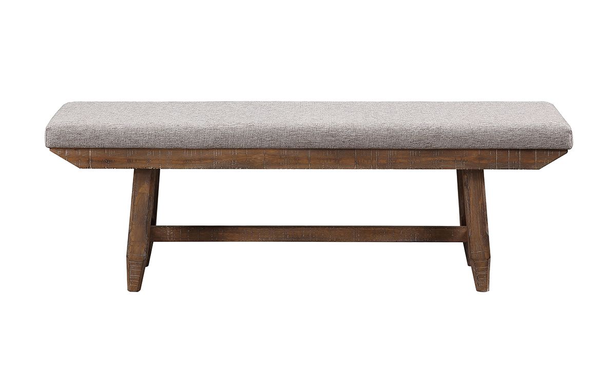 As a comfortable, casual desk seat at the foot of the bed or in an entry hall or paired up with the matching Riverdale Driftwood dining collection in the dining room or kitchen, the Riverdale Driftwood Upholstered Bench effortlessly elevates any room setting. Crafted from rough-hewn Pine and Rubberwood solids and sealed in a warm Driftwood finish, the understated base of this 60-inch wide bench finds a perfect pairing in the fabric-upholstered seat cushion above, lending a tailored versatility to the understated design.