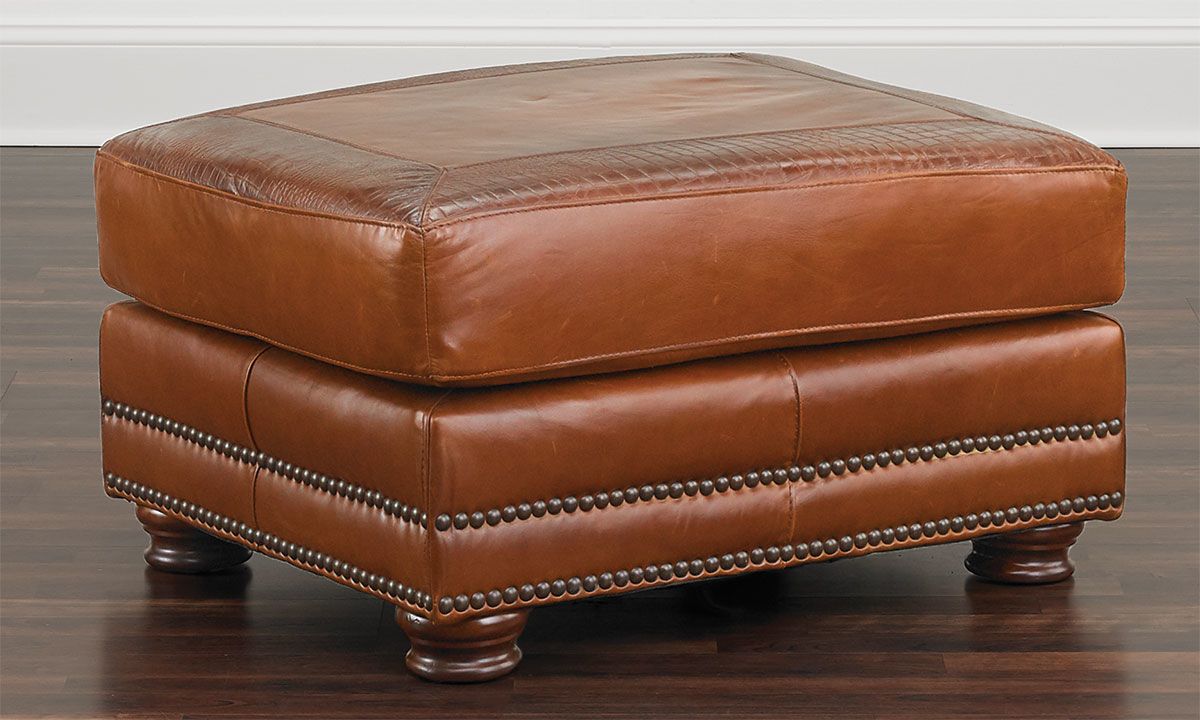 Complete your décor with this carefully crafted, 100% top grain leather ottoman, made with an 8-way hand tied coil system and down-blend pillow top cushioning for lasting comfort. The traditional shape blends effortlessly with any décor style, with its rich, cognac hued leather trimmed in decorative stitching, bronze nail heads and subtle alligator embossing to give the timeless style a worldly appeal.