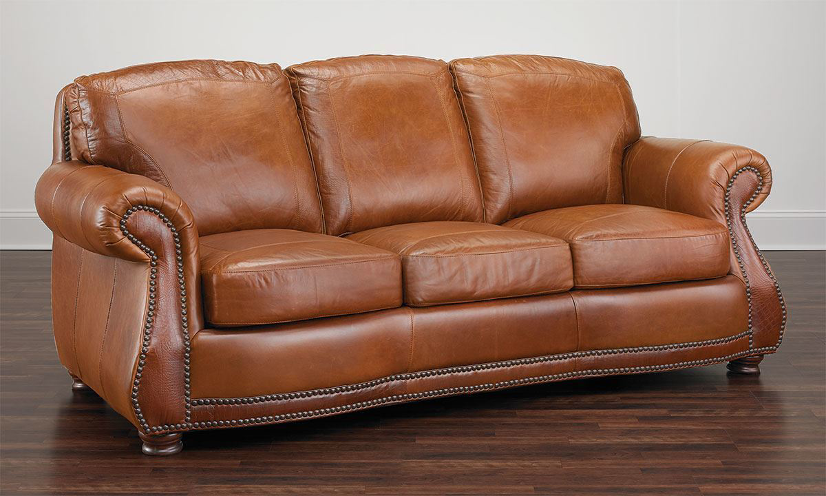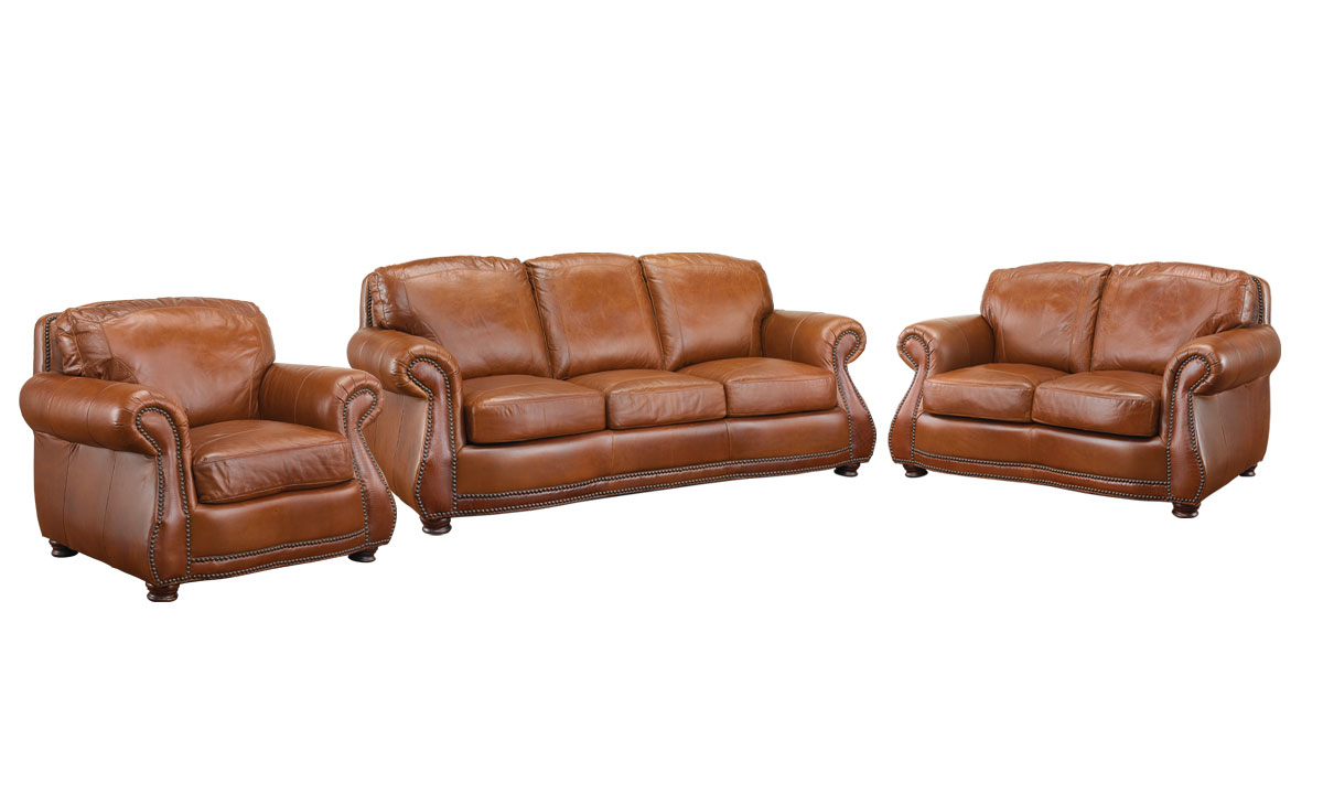 Introducing a beloved heirloom to your home doesn’t have to mean breaking the bank when you can get high-quality, 100% top-grain leather living sets at almost half off the market price. Built for lasting durability, this 3-Piece set is handcrafted using an 8-way hand-tied spring system where each coil is individually wrapped to give you greater comfort and longevity. Down blend seat pillow tops and high-density foam cushions give you pieces that won’t lose their shape as the supple, top-grain cognac-colored leather upholstery builds character with age. Though the thick, rolled arms and high-backed frame epitomize timeless traditional style, added details such as the nail head trim, decorative stitching and subtle alligator hide embossing along the back pillows, front rail and stump panel give it a little unexpected personality to set your décor apart from the rest.