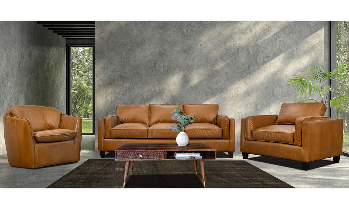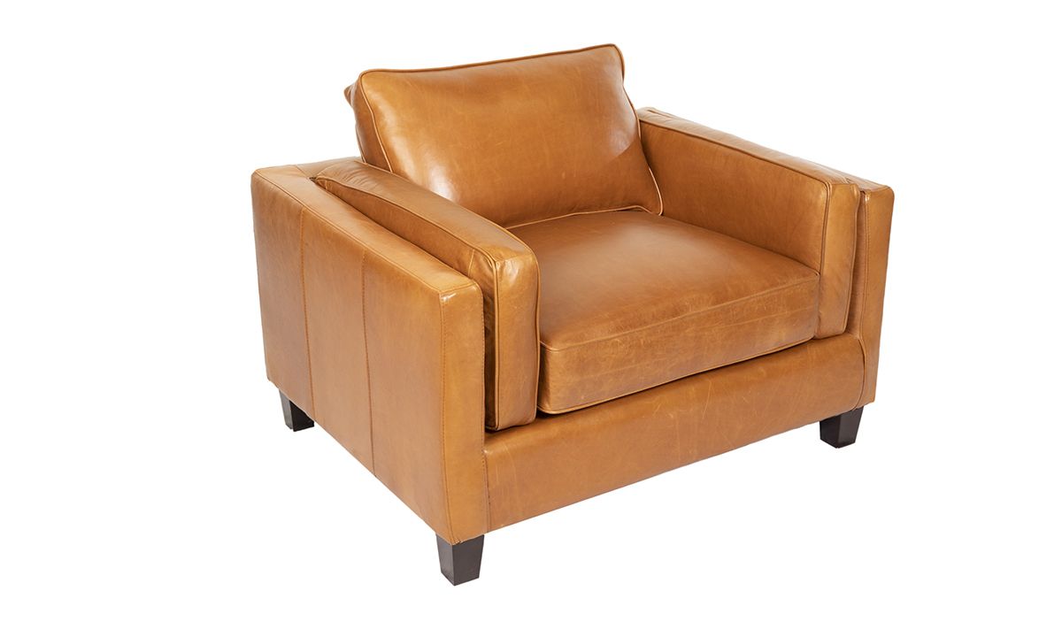 Create a cozy, stylish corner in any space in your house with the top-quality construction and unforgettable design of the Rocky Mountain Leather Taos Butterscotch Armchair. Carefully hand-crafted in America for lasting resiliency, this 43-inch wide arm chair starts with a solid hardwood frame and eight-way hand tied coil spring support system, each coil carefully hand wrapped in muslin fabric for greater longevity. Plush, high-density foam cushions, complete with luxurious down-blend seat cushion toppers are then enveloped in rich, Butterscotch tan 100% top grain leather, for a look and feel that will only get more comfortable, and beautiful, with age. A modern, linear silhouette, distinguished by detached double armrests and a low-slung frame, give this chair a sleek, stylish appeal that is sure to elevate any living space.