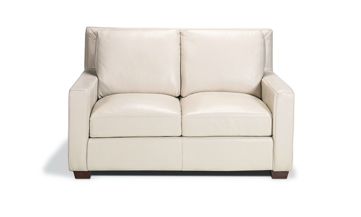 Find top grain leather upholstery in a contemporary bone white colorway on this handcrafted loveseat featuring feather down blend cushion toppers and an eight-way hand-tied coil spring support system for lasting comfort and durability.