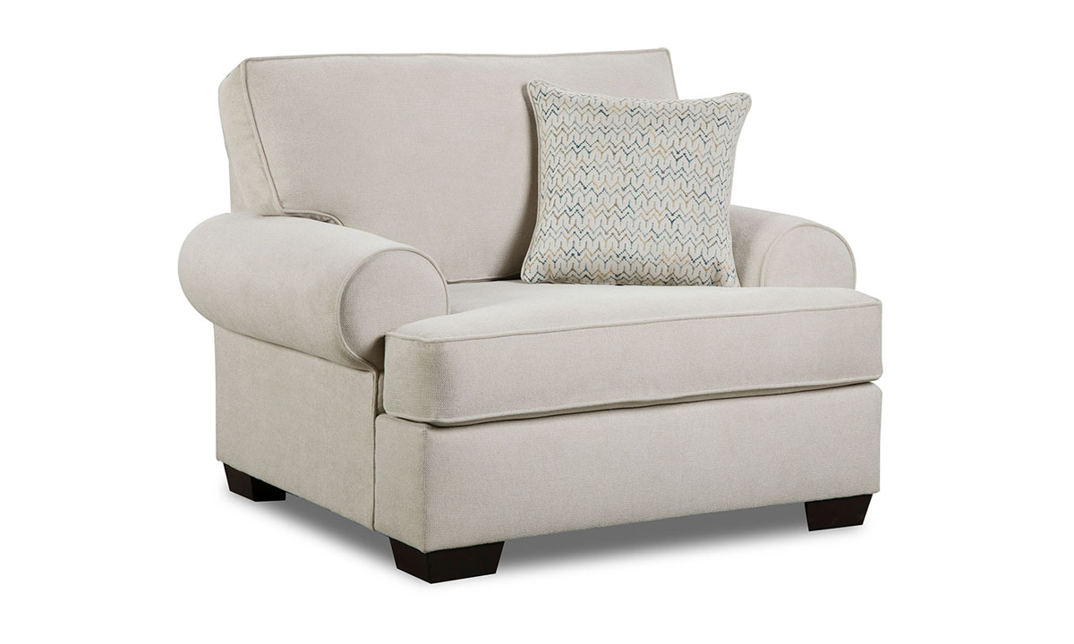 This roll armchair from Main & Co. is made in America and features one throw pillow wrapped in a matching upholstery fabric--all in a soft fosse cream color hue.