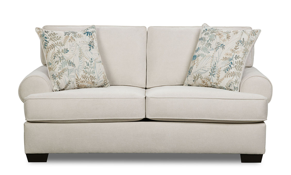 This roll arm loveseat from Main & Co. is made in America and features two throw pillow wrapped in a matching upholstery fabric--all in a soft fosse cream color hue.