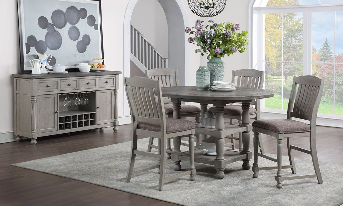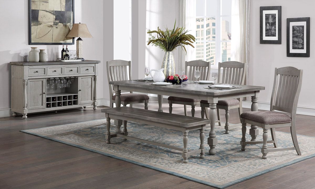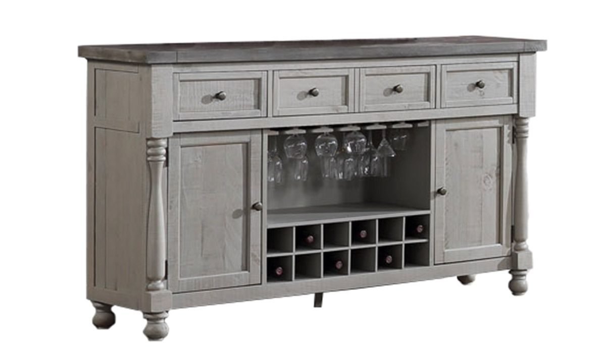 Timeless 67-inch wide server features a two tone grey wood finish and includes four storage drawers, two cabinets, a twelve bottle wine rack and stemware holder.