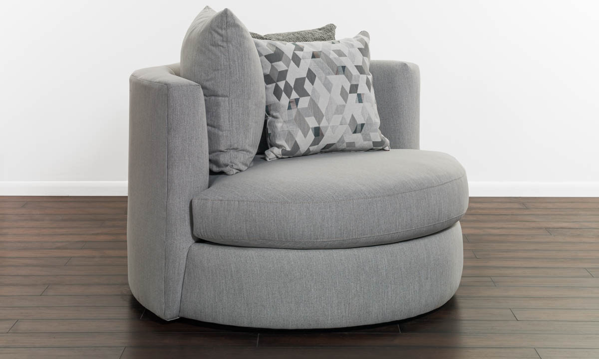 Enjoy the clean and classic styling of this 3-piece living room set includes sofa, loveseat, and swivel chair featuring soft malibu dove gray fabric upholstering and including coordinating toss pillows.