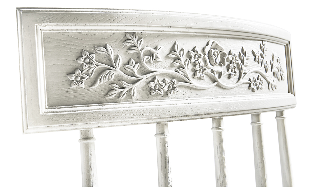 Artful hand carved floral motif across serpentine drawer