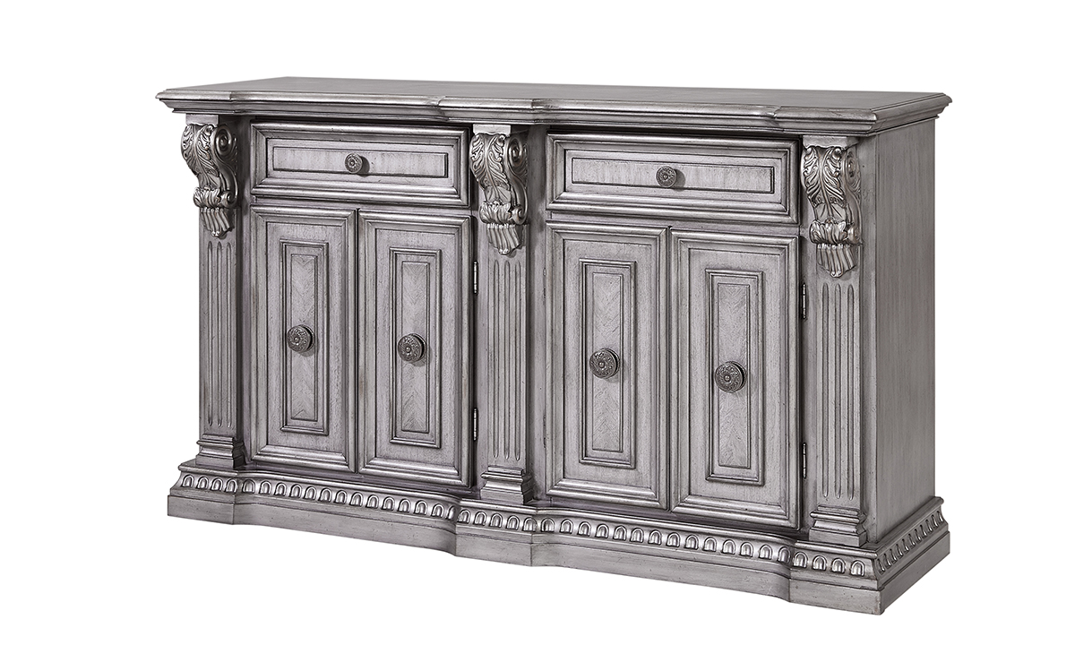 Enhance your dining space with the Carnegie Manor Platinum 4-Door Sideboard. Its platinum finish, coupled with the luxurious Prima Vera veneer, adds a touch of opulence. The design, featuring fluted sides and dental molding, speaks to a refined taste. This 2-drawer, 4-door server offers ample storage without sacrificing style, making it a perfect blend of functionality and elegance. The intricate details and fine craftsmanship make it an essential piece for those seeking a distinguished and stylish setting.