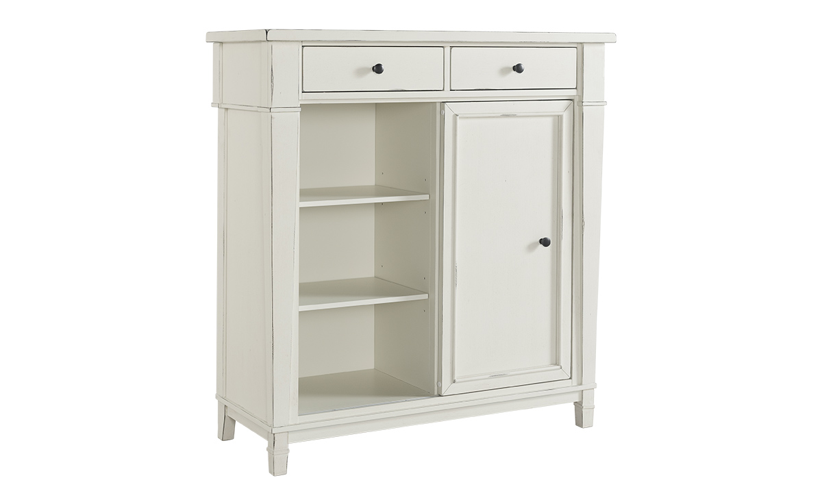 Discover the Northport White Sliding Door Chest, an exquisite piece of luxury bedroom furniture. This chest features six drawers and three shelves behind a sliding mirror. The antique white finish and blackened metal hardware add a touch of modern farmhouse elegance, making it a perfect addition to any stylish retreat.