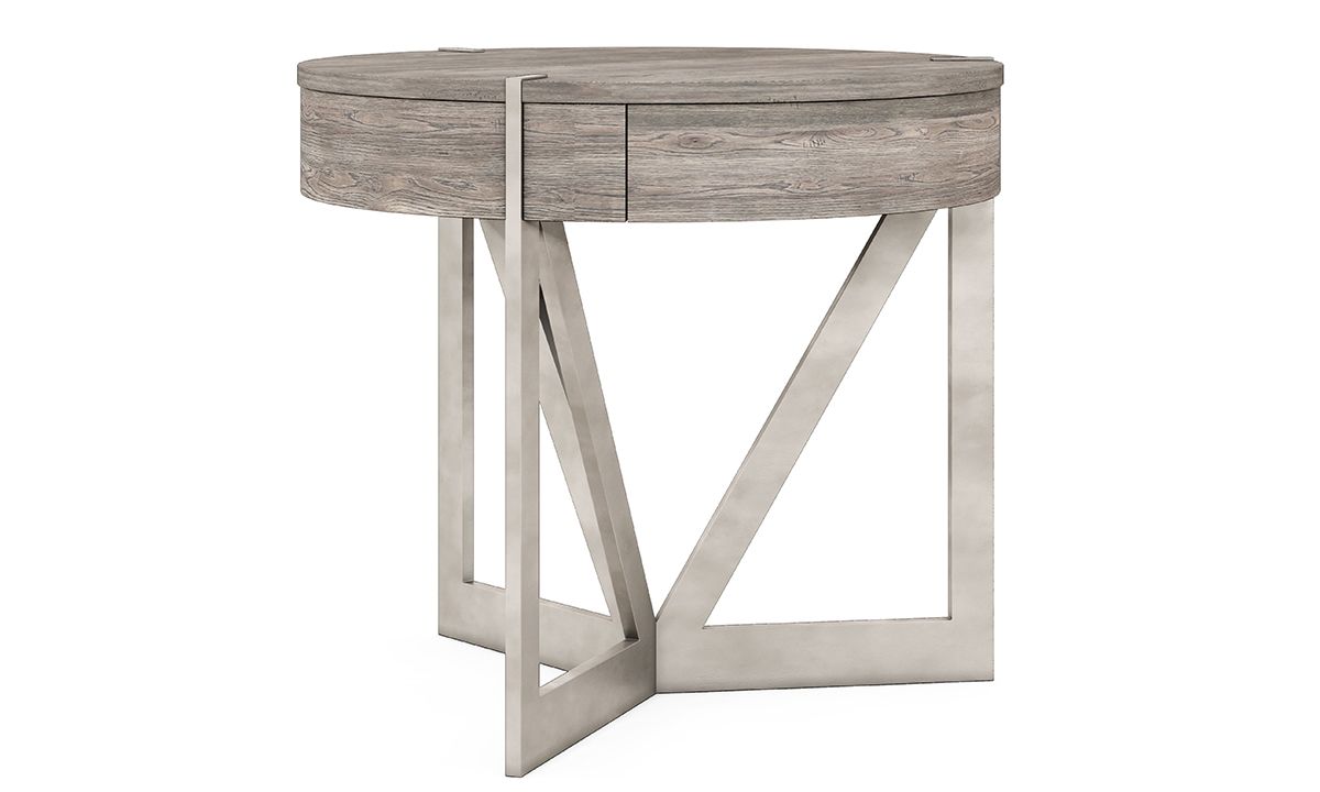 Industrial and charming, the End Table with storage drawer is made from Ash solids with knotty oak veneers in a natural gray finish. The metal base is finished in vintage pewter.
