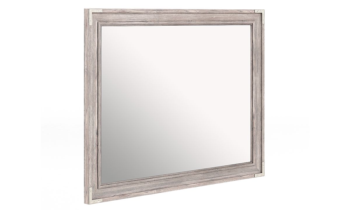 The Sojourn Natural Grey beveled glass mirror is featured in ash solids with knotty oak veneers and natural grey and hand painted lacquered finish with cast metal corner brackets.