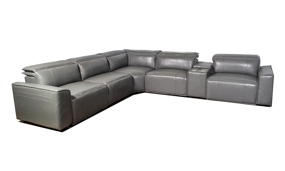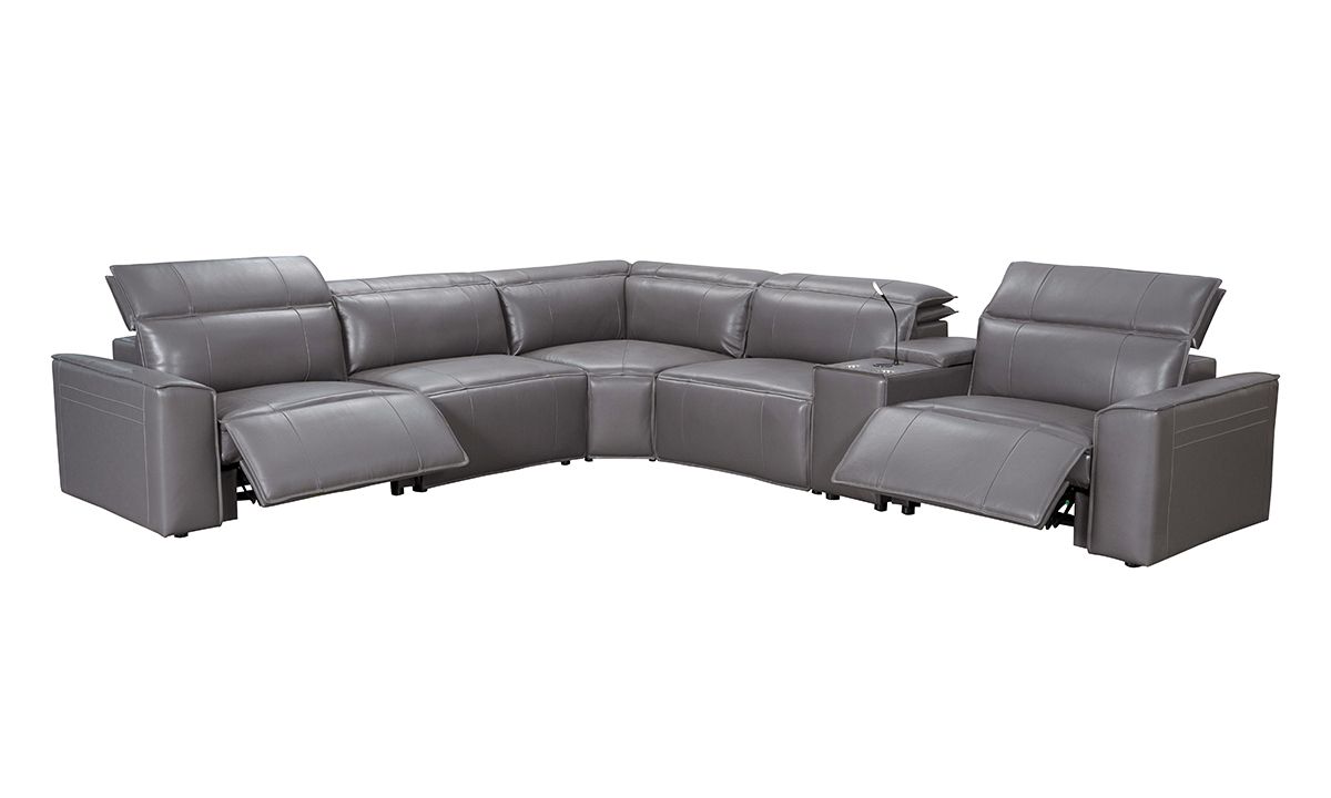 Contemporary six-piece sectional boasts two power recliners with power headrest, storage, cupholders, wireless and USB charging ports upholstered in soft gray leather.