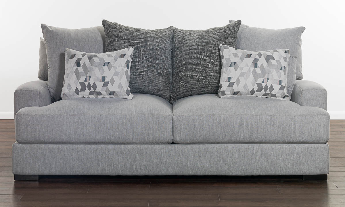 Enjoy the clean and classic styling of this track arm sofa featuring soft malibu dove gray fabric upholstering and including coordinating toss pillows.