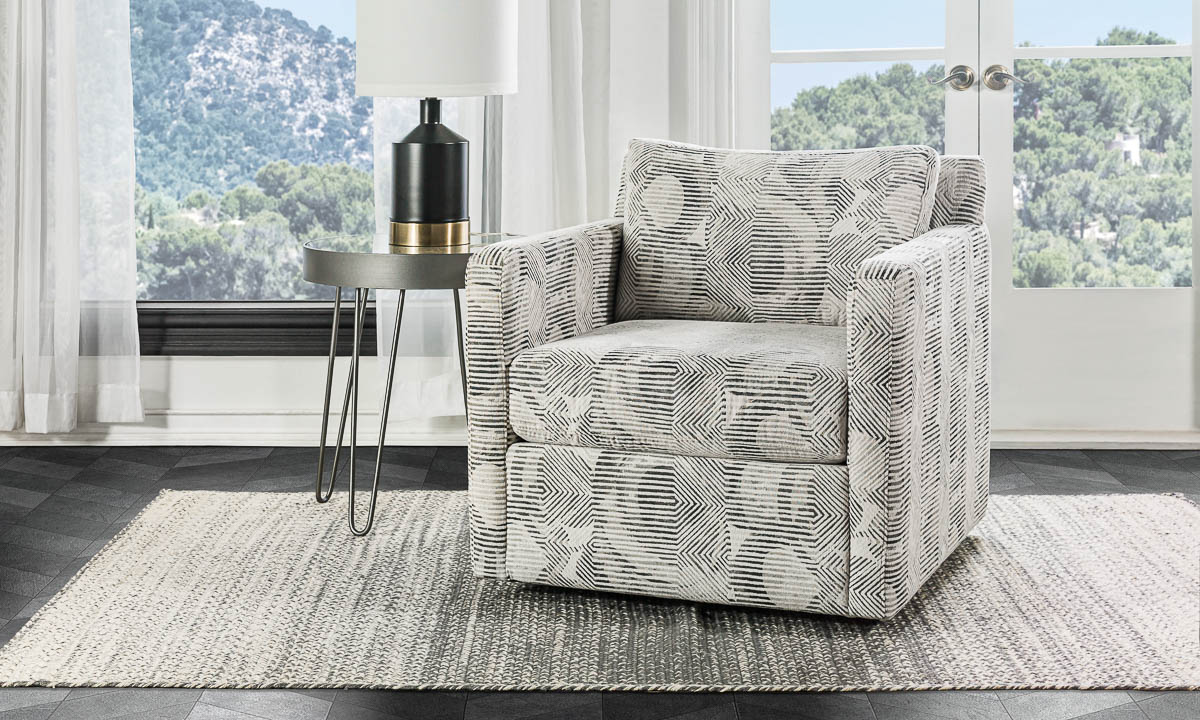 Relax and unwind in this brilliantly upholstered, meticulously crafted, and versatile swivel chair. Made with a contemporary gray and off-white pattern, this chair will accent any living room beautifully.