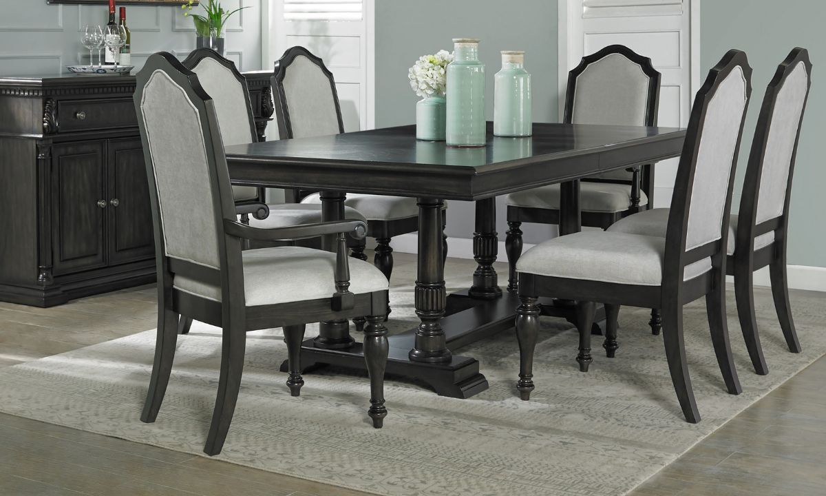 A traditional piece with an elegant feel, this dining table from Manor Row is crafted from hardwood solids in a dark, Mink finish.